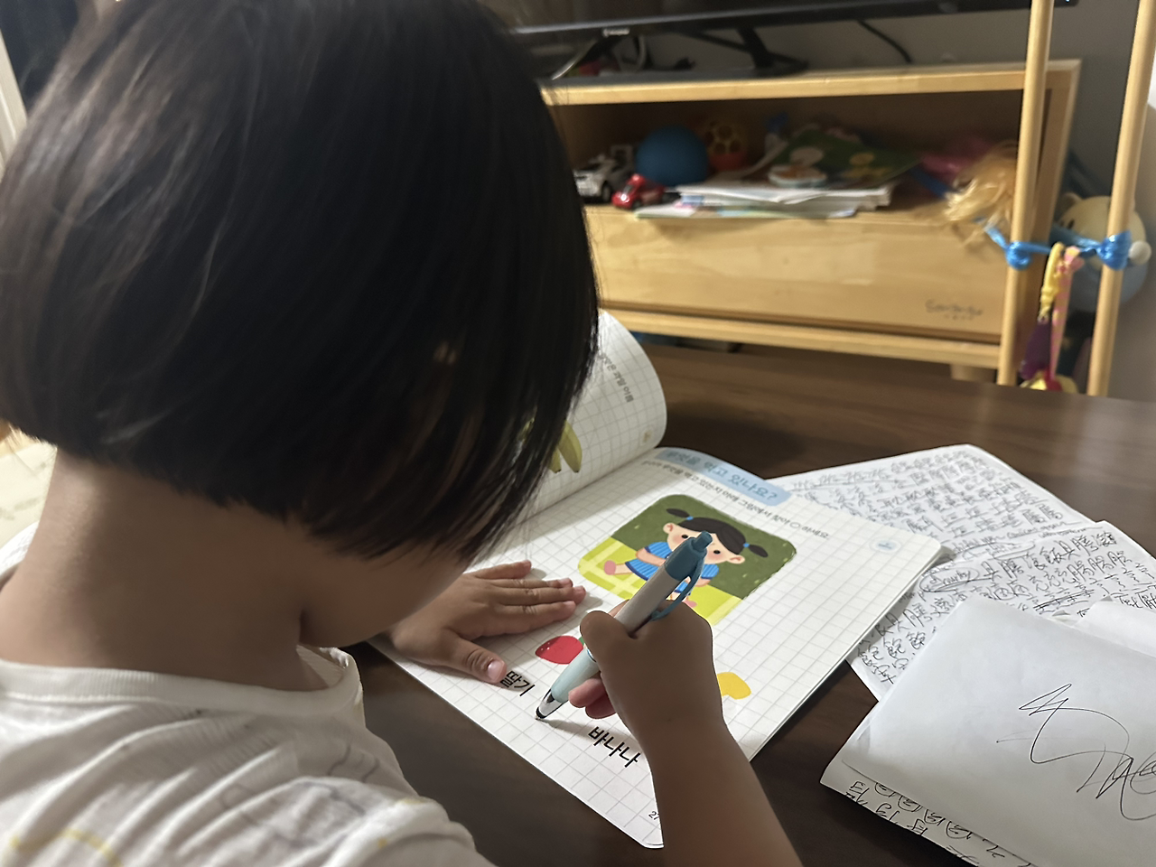 소은이 글씨 쓴다는 말에 제 고모가 대번에 영상통화를 걸어 칭찬해주면서도, 소은아, 무조건 니 이름이 먼저야, 이름부터 쓰자, 고 꾀어도 아니야, 이름은 어려워 꼬모 선생님, 채소, 과일 먼저 쓸꺼야! 하며 언성을 높였다. 그러다보니 흥이 나서 티비는 잊어버리고 저 스스로 글씨쓰네 그림그리네 하다 한시간이나 공부하고는 잘 시간을 놓쳐 제 어미 보고싶다고 느닷없이 칭얼대다 이제야 잠듦 ㅜㅜㅜ