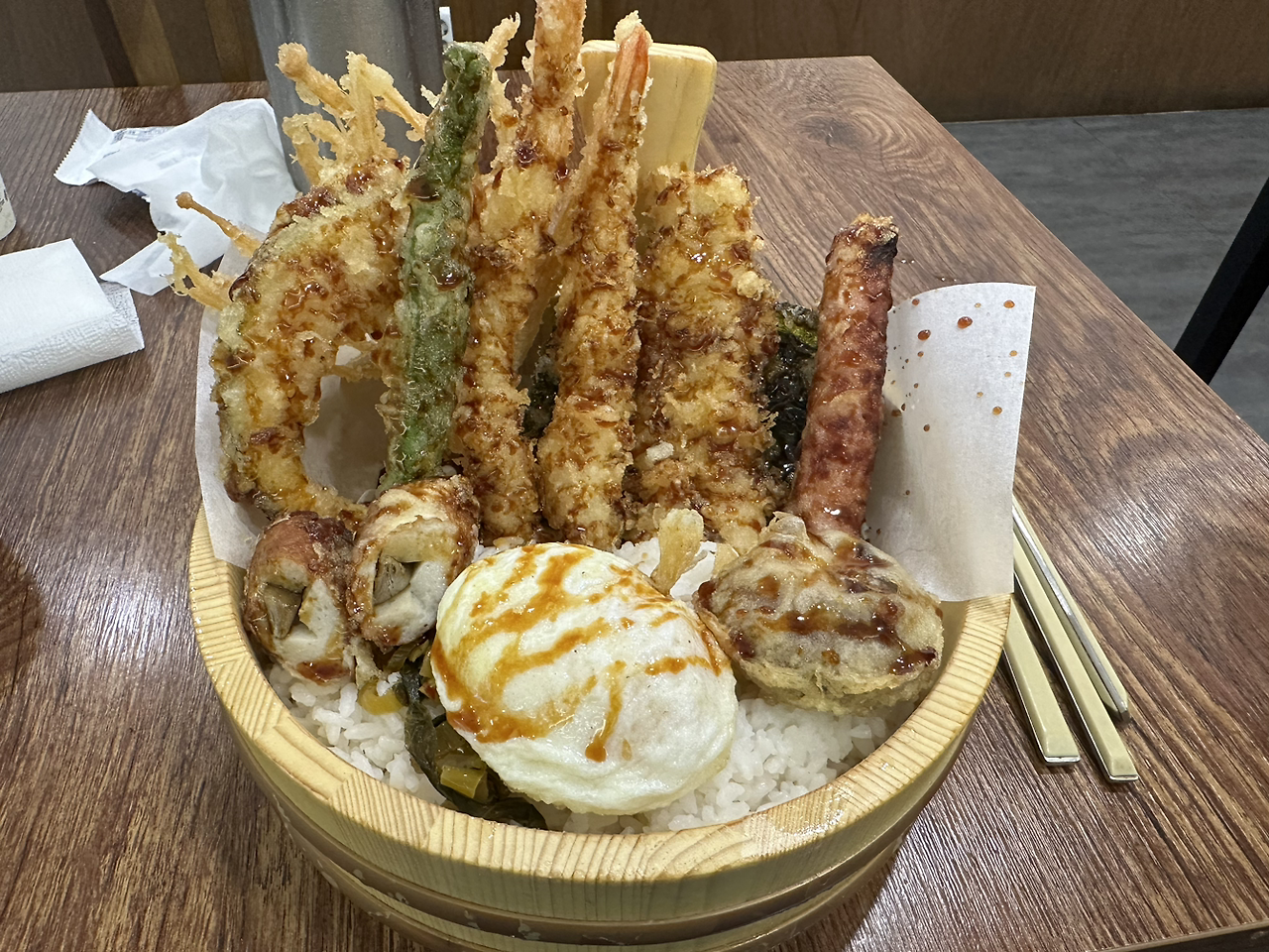 ㅡ 그나마 먹을만한건 당연하겠지만, 새우튀김 2개 뿐이었는데 아주 익숙한 맛이고, 그 외엔, 두툼한 팽이버섯 1, 고기말이 2, 스팸어묵말이 2, 고추튀김 1, 표고버섯 1, 붕장어튀김 1, 단호박 튀김 1 이 정도로 기억하는데, 프랜차이즈라기엔 가격이 비쌌고, 그 가격에 이 식재료들을 기름에 튀긴것치곤 너무 맛이 없었어… ㅜ 튀김은 너무 느끼해서도 안되지만, 농염하고 화려하면서도 깔끔해야 된다구ㅜㅜ이 더위에 튀기시느라 애는 쓰셨습니다만 ㅜㅜ 흑흑. 아니, 그리고 누가 햄처럼 빈약한 가공육을 튀깁니까ㅜㅠ 기름에 구워서 염분이 도드라지게 해야죠ㅜㅜ