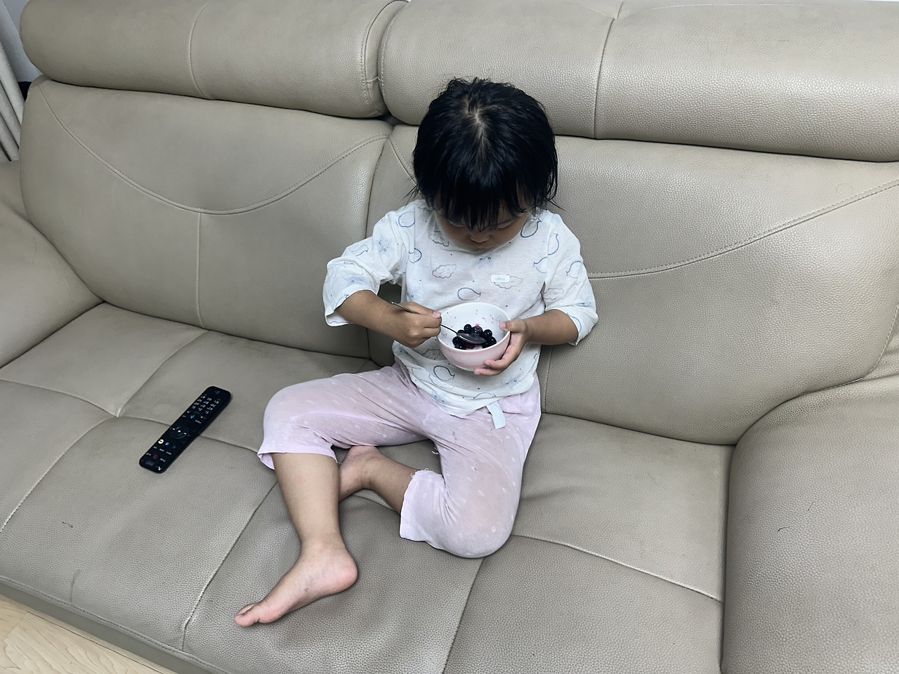 ㅡ (주방으로 달려가서 옥수수랑 밥 엄청 퍼먹고 배 두드리며) 이제 소은이 여섯 살이에요, 아빠, 이제 수영장 갈수 있어요?