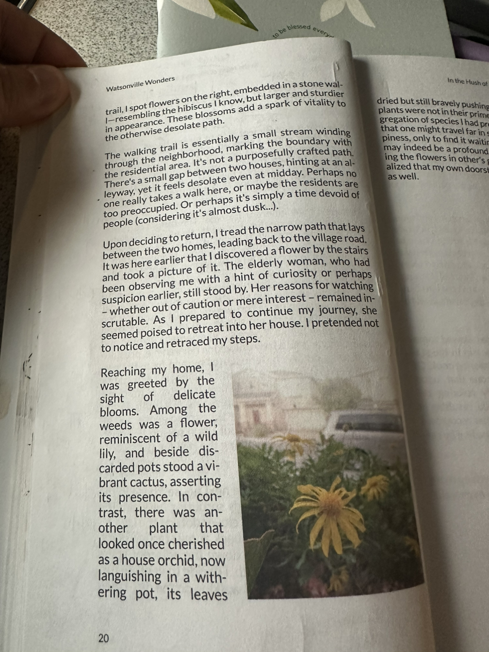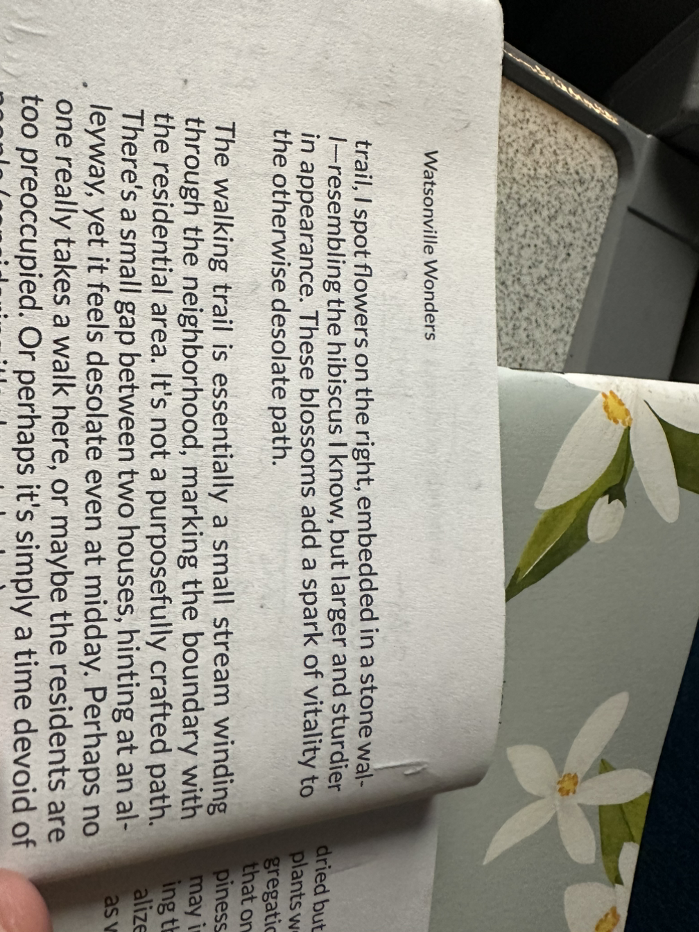 trail, I spot flowers on the right, embedded in a stone walI resembling the hibiscus I know, but larger and sturdier in appearance. These blossoms add a spark of vitality to the otherwise desolate path.