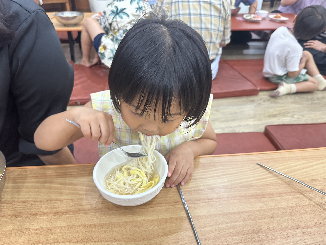 육수가 아주 맛있단 생각은 안 들었어요. 잔치국수 육수는 연했지만 무난했고, 콩국물도 고소하고 시원했지만, 아주 뻑뻑하게 진하진 않았어요. 그런데 국수치곤 늦게 나오더라니, 면을 직접 수타로 치셨나? 싶을 정도로 면이 엄청 좋았습니다. 소면이었지만 중면 못지 않게 탱글탱글하구요, 무엇보다 잘 불지 않더군요. 저는 보통 소은이가 먹다 남기는 음식을 마저 먹는 경우가 있는데, 소은이가 꽤 오래 방치한 잔치국수를 후루룩 먹었는데도 국수가 전혀 불지 않아서 신기했어요. 가수율이 높은 면이었을까요? 자, 그렇다면 문제, 면이라면 가리지 않고 덤비는 국수대장 전소은이 웬일로 국수를 다 남겼을까요? 실제로 국수 불도록 방치한 적이 있는 민물장어라도 나왔을까요?