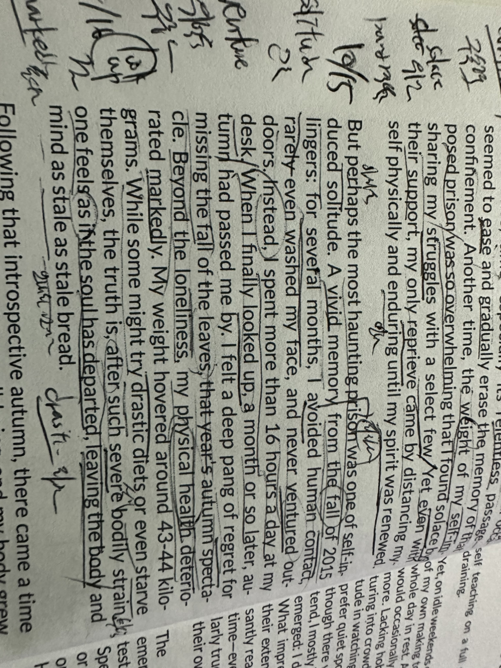 마침내 고개를 들어보니 한 달여가 지난 지금 가을이 제 곁을 지나가고 있었습니다. 그해 가을의 장관이었던 낙엽의 가을을 놓친 것에 대해 깊은 후회의 고통을 느꼈습니다. 외로움을 넘어 제 몸의 건강도 눈에 띄게 나빠졌습니다. 몸무게는 43~44킬로그램 정도였습니다. 어떤 사람들은 급격한 다이어트를 시도하거나 심지어 굶는 경우도 있지만, 사실은 그렇게 심한 신체적 부담을 겪은 후 영혼이 떠난 것처럼 느껴져서 몸과 마음이 오래된 빵처럼 진부한 상태가 된다는 것입니다.