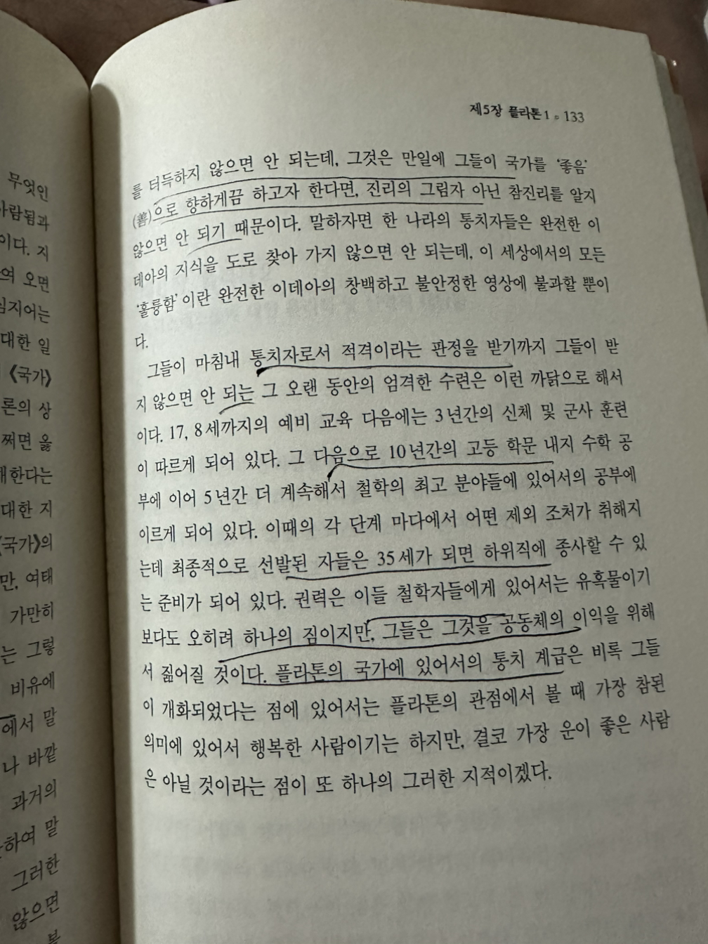 오히려 그는, 지배계층에게 거의 금욕에 가까울 청빈과 전문적 지식을 요하는 플라톤의 국가관에 대해 설명한다. 자연철학과 법 등에 능통했던 소피스테스들로부터 플라톤은 적대관계에 있었다. 그는 다수의 폭력으로 살해당한 소크라테스의 전례를 비추어 민주주의는 중우정치 衆禹政治 의 수단에 지나지 않으리라 보았다. 그는 고결한 인품과 지식을 갖춘, 소수의 철학자들이 통치하고, 전문 군인들이 나라를 지키고, 그 아래 시민과 노예가 있는 사회를 꿈꾸었는데, 인간 또한 이러한 3요소로, 이성, 영혼, 용기(의지)가 있어야 한다고 보았다.