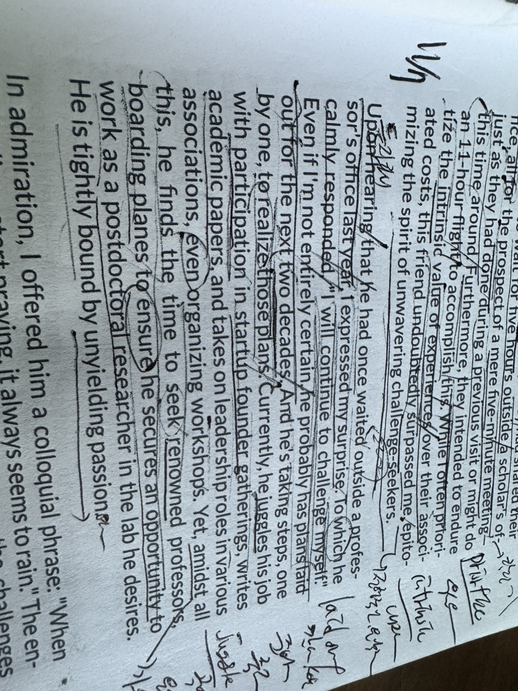 듣자하니, 그는 지난 해 교수의.사무실 앞에서 지키고 선적도 있었다고 했다. 내가 놀라움을 표시하자, 그는 조용히 “스스로 계속 도전하고 싶어서.” 라고 답했다. 비록 내가 정확히는 잘 모르지만, 그는 적어도 향후 이십여년을 위한.계획 정돈 미리 쌓아두었을 거다. 그리고 그는 그 계획들을 실현하기 위해 한발한발 나아가고 있었다.현재 그는 스타트업 개발자 참여 모집, 학위 논문 작성, 다양한 협회에서 지도력있는 역할 수행뿐 아니라 심지어 워크숍 조직까지 하며 곡예 같은 직장 생활을 하고 있다. 그럼에도 불구하고 그는 이 가운데, 유명한 교수를 쫓아, 박사학위를 받고나서 그가 희망하는 연구실에서 연구를 계속하기 위해, 그 기회를 찾아 확신에 차 비행기에도 올랐다. 그는 결코 양보할 수 없는 열정으로 가득 차 튀어오르고 있었다.