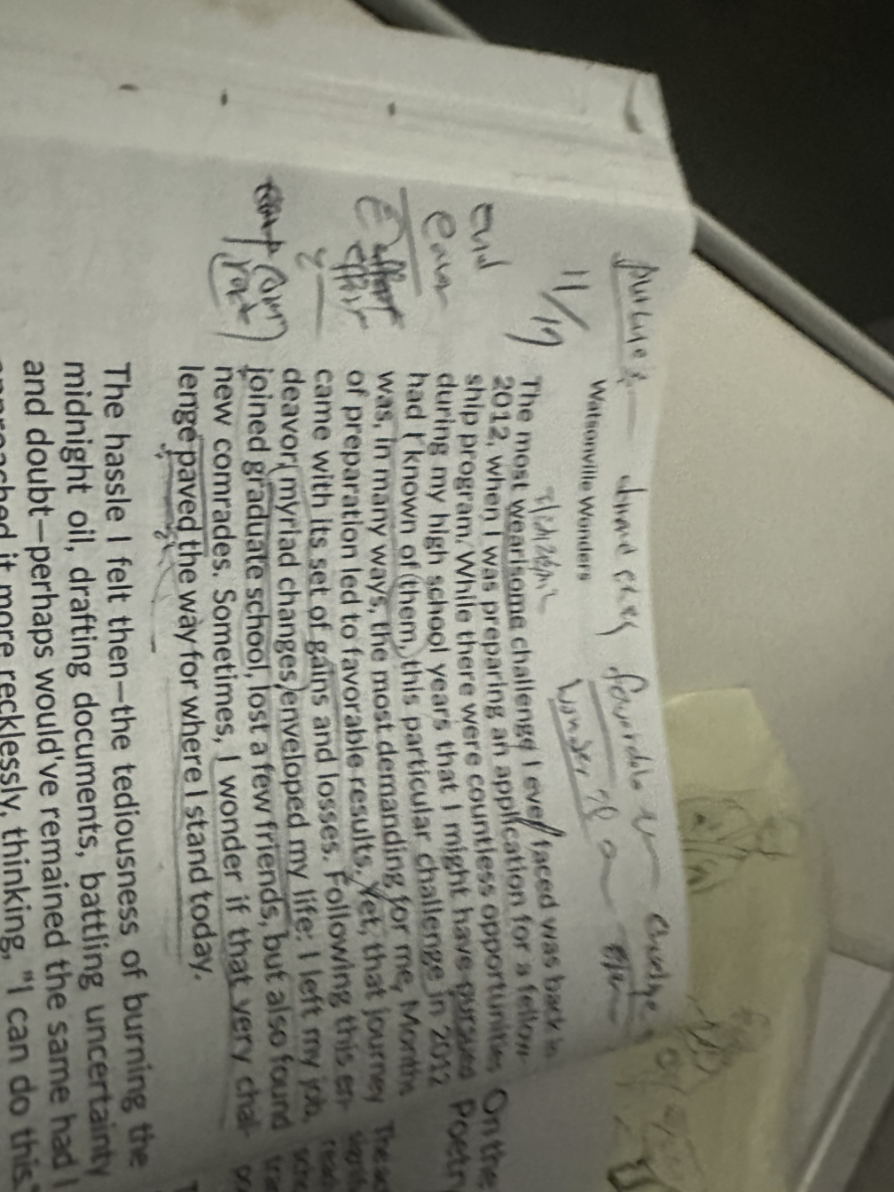 The most wearisome challenge | ever faced was back in 2012, when was preparing an application for a tunities shir program. While there are countless opportunities daring my high schooh years that i might have pursued had I known of them, this particular challenge in 2012 was, in many ways, the most demanding for me. Months of preparation led to favorable results. Yet, that journey came with its set of gains and losses. Following this endeavor, myriad changes enveloped my life: I left my job, joined graduate school, lost a few friends, but also found new comrades. Sometimes, I wonder if that very challenge paved the way for where I stand today.