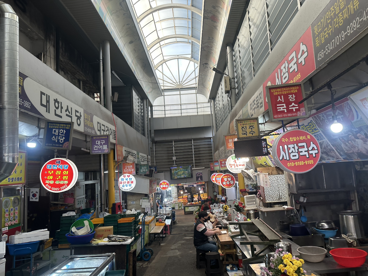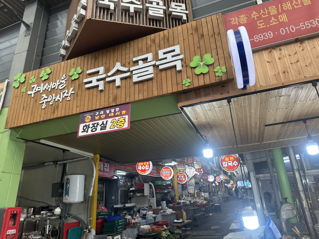 늦은 단풍철로 차표 구하기가 어려워 중간에 만난 곳이 구미 옛 시가지였다. 커다란 구미 중앙시장 안에 국수골목이 있다고 하여 소은이를 앞세워 골목골목 사이를 누볐다. 아이는 제 어미와 외할아버지를 본데다가, 저 좋아하는 국수까지 먹는다니 두 눈에 기쁨이 가득해서 얼른 가요, 얼른 가요 방방 뛰며 신이 났다. 지금 생각해도 갑자기 눈시울이 또 시큰한데, 원래 아이는 그렇게 뭐든 먹고 싶고, 놀고 싶고, 제 어미를 보고 싶은 것이다. 나는 아이가 구김살없이 잘 놀고 신나하면 괜히 좋아서 눈물이 날때가 있다. 아직도 호떡 하나에 500원, 떡볶이 하나에 2,000원씩 파는, 옛 가격의 시장 골목을 돌아다니다보니 약간 높은듯한 언덕이 보이는데, 보이는 곳마다 온통 국수, 국수, 국수 간판이었다. 누가 안 물어봐도 국수 골목이라고 능히 알 수 있었다.