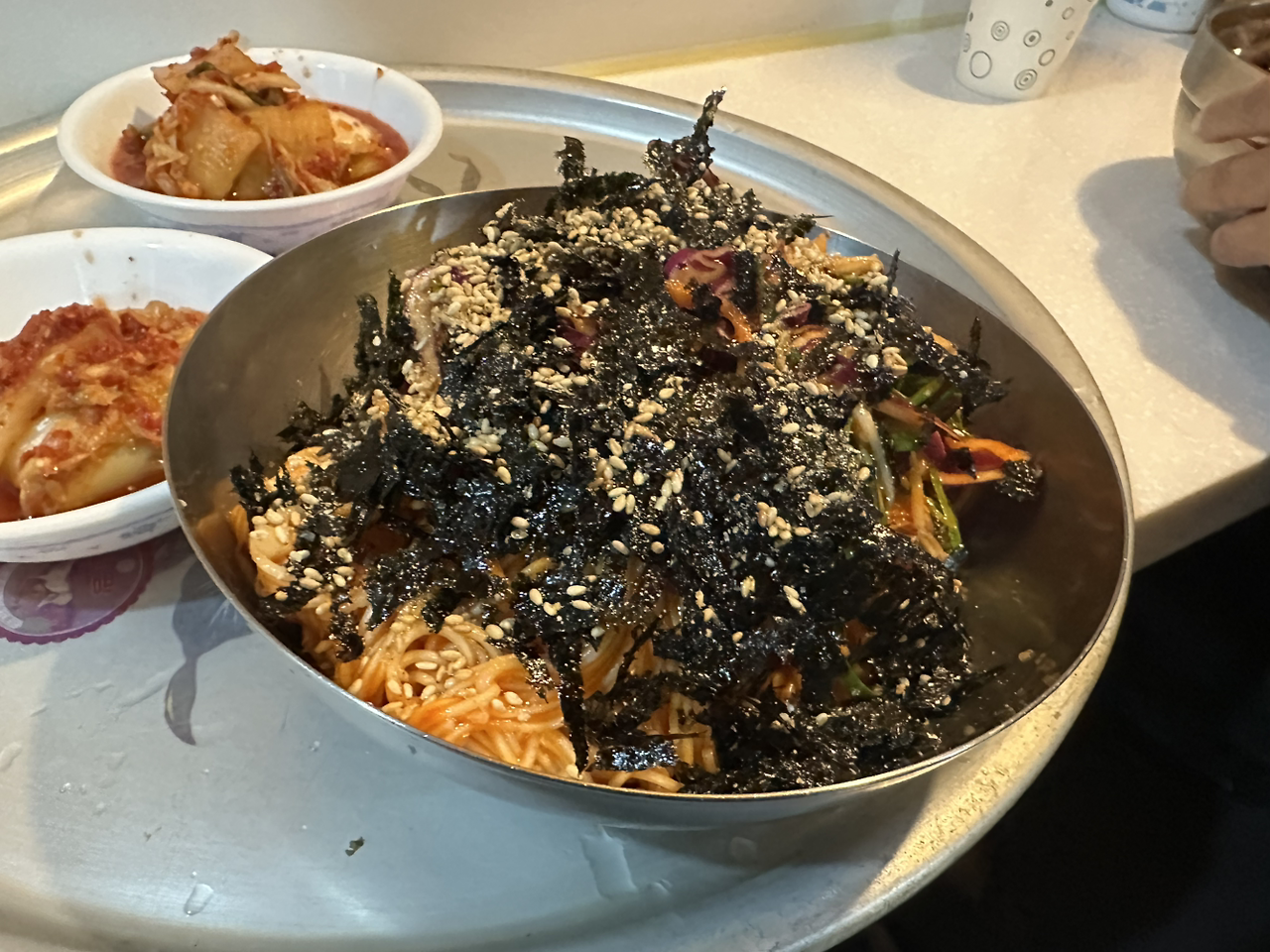 육수는 분명 좋았습니다. 멸치로 우린 육수에 김가루를 가득 뿌렸는데, 김도 진한 파래김이라, 정말로 구수한 김향이 하나 가득 풍겼어요. 그 김향이 정말 국수 전반을 지배하는 듯했습니다. 아버님은 묵사발을 드셨는데, 묵사발이 가장 맛있었어요. 구수한 육수에 탄력 있는 묵이 어우러지니 절로 목구멍으로 넘어가더군요. 아내와 아이는 잔치국수를 먹었고, 나는 비빔국수를 주문해서, 아내와 서로 나눠먹었습니다.