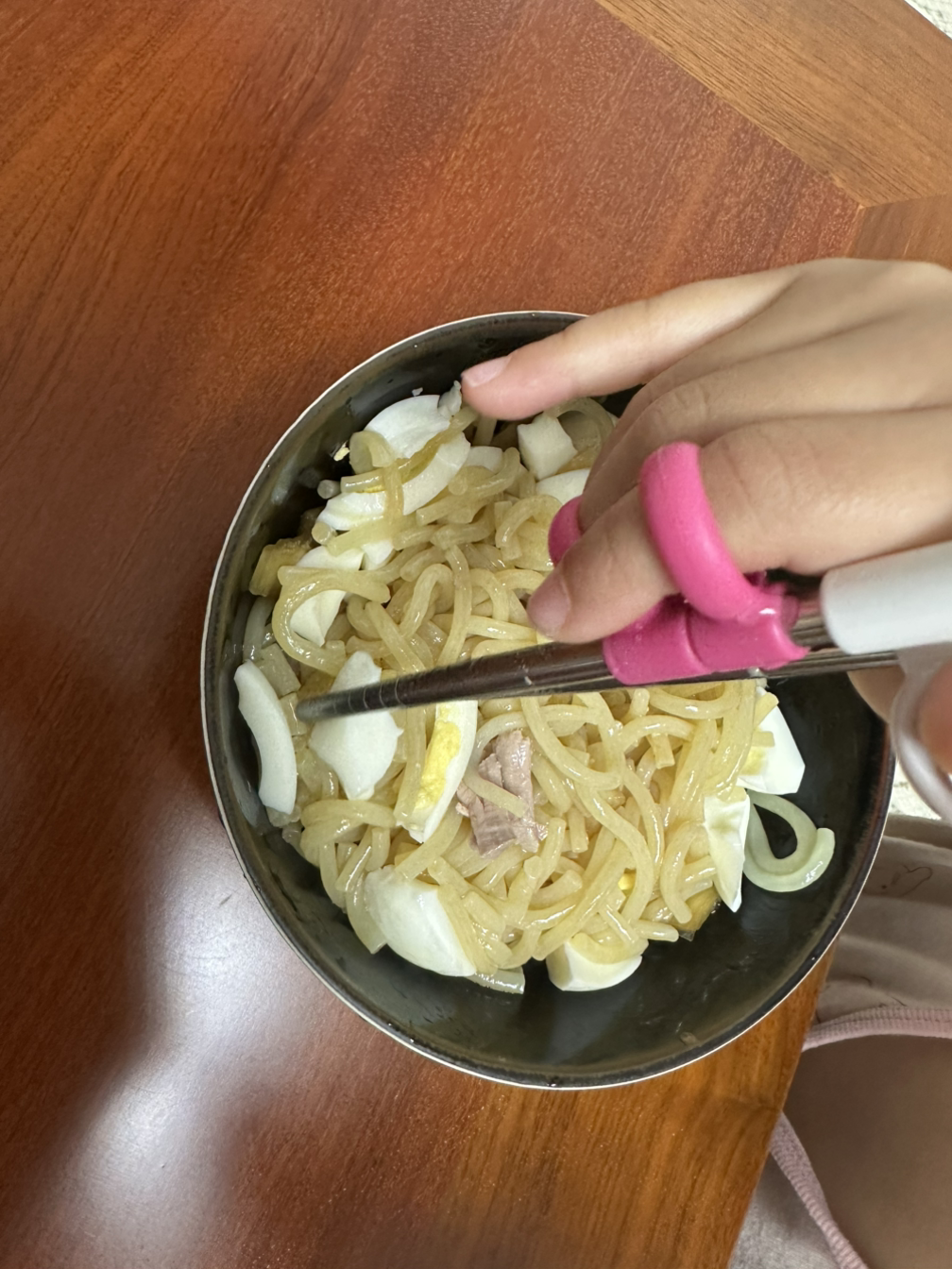 또 몇 번 이야기하지만, 소은이는 정말로 국수를 좋아한다. 하지만 어머니는 손녀에게 밀가루 음식 먹이는 것을 썩 좋아하지 않으신다. 그러므로 웬만해선 뭐든지 해달라는 건 다 해주는 아버지- 할아버지에게 소은이도 은근히 눈치보며 조르는 편이다. 할머니도 가끔 냉면을 해주시긴 하고, 그 냉면에 대한 감평도 여름 되면 쓸 예정이지만, 할머니는 냉면 한번 하시려면, 면이야 사다 쓰신다 해도, 육수는 한우 사다가 직접 하루 종일 우리시고(진짜로!), 거기에 겨우내 김장해서 뒷산에 묻어둔 독에서 김치와 육수 꺼내다 말아주시는 등 일이 매우 커지므로(^^;;), 아버지는 내가 출근이 늦어 함께 소은이 등원을 준비하는 아침에 가끔 국수를 말아주셨다. 마트에서 사온 쫄면을 삶아 찬물에 씻고, 김치를 물에 헹궈 잘게 썰은 뒤에, 삶은 달걀과 결대로 찢은 고기(소은이의 단백질을 위해서 항시 준비중), 간장과 참기름을 부어 적당히 손으로 비비면 끝! 흔히 아기국수라고도 부르는 간장 국수의 고급화 수준이라고 할 수 있겠다.