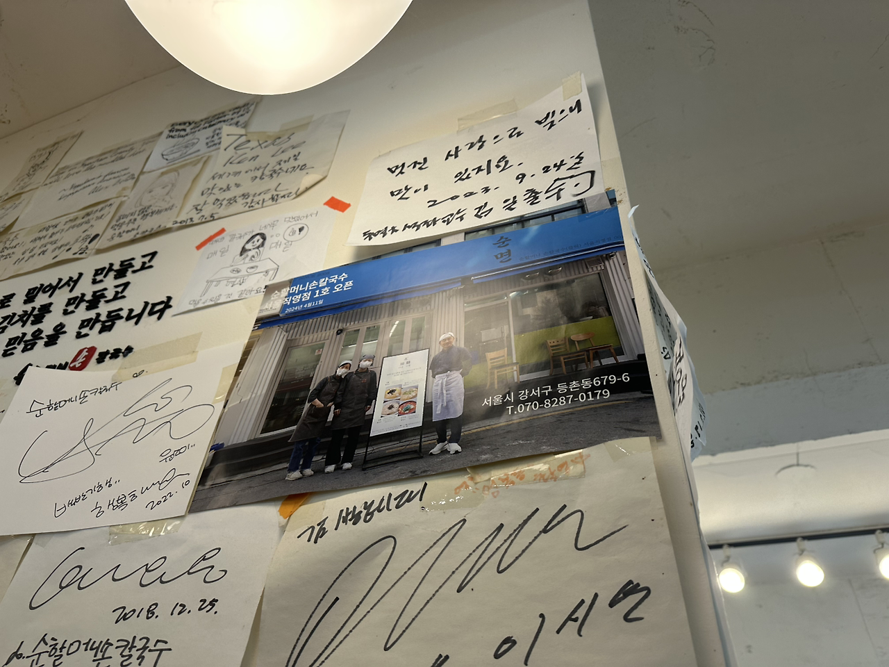 허름하고 휑한, 지방 소도시에 까페가 아닐까 싶을 정도로, 아기자기 예쁜 외관이 눈에 띕니다. 저도 처음에 언뜻 보고는, 까페 아닌가 싶을 정도였으니까요. 문을 열고 들어가면, 좁은 통로 왼쪽에 손 씻는 세면대가 있고, 주문을 받고 음식을 나르는 이른바 '서빙 로봇' 이 바쁘게 움직이며 손님을 맞아줍니다. '우와, 로보트다! 엄마아빠, 보세요, 로보트가 국수를 갖다줘요!' 소은이가 가장 좋아하지요^^;; 일단 얼굴에 끼얹어지는듯한 구수한 국물 향이 장난 아닙니다. 연예인들도 많이 왔다간듯하고, 그 유명한 식객의 허영만 화백께서도 방문하셨었네요. 허영만 화백이나 백종원 사장의 입맛이 절대적인 기준이 될순 없고, 저도 좀 경계하는 편입니다만, 개인적으로 허영만 화백 다녀가셨던 집은 그래도 제 입맛에 비교적 맞았던 경험이 많습니다.