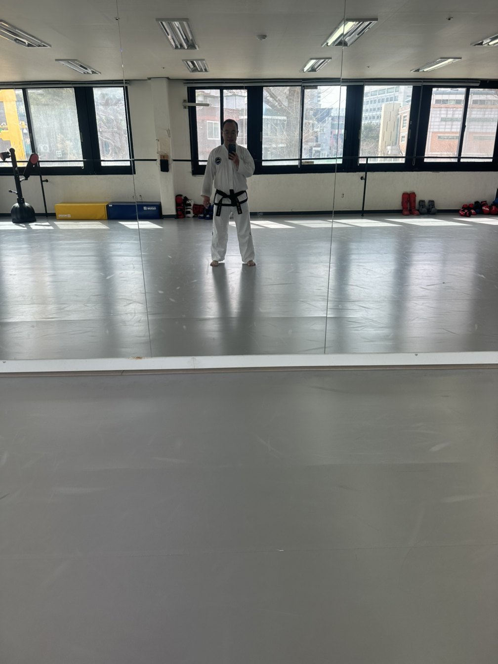 오랫동안 잘못된 자세로 연습해왔다. 이제서야 정자세를 지키려 노력하며 애쓴다. 사현님과 콜라 부사범은 오전.일찍부터 대회 준비 행정 업무를 보고, 나는 빈 도장을 혼자 휘저으며 기초 동작과 발차기, 보 맞서기를 연습했다. 양.고관절을 지속적으로 돌리며.늘렸고, 무릎을 높이.든채 유지하려 애썼고, 발끝이나 발칼을 꽂을때 허리를 함께 밀어주었다. 특히.돌려차기 를 할때.허리를 중심으로 상체가 버텨주지 아니하면 결국, 발도 더 낮아지고 발끝도 물러 힘있게 꽂아차지 못한다. 날이 풀려서 조금만 움직여도 금새.땀이 줄줄 흘렀다. 나는 다리를 오래, 수시로 풀어주며 연습했다.