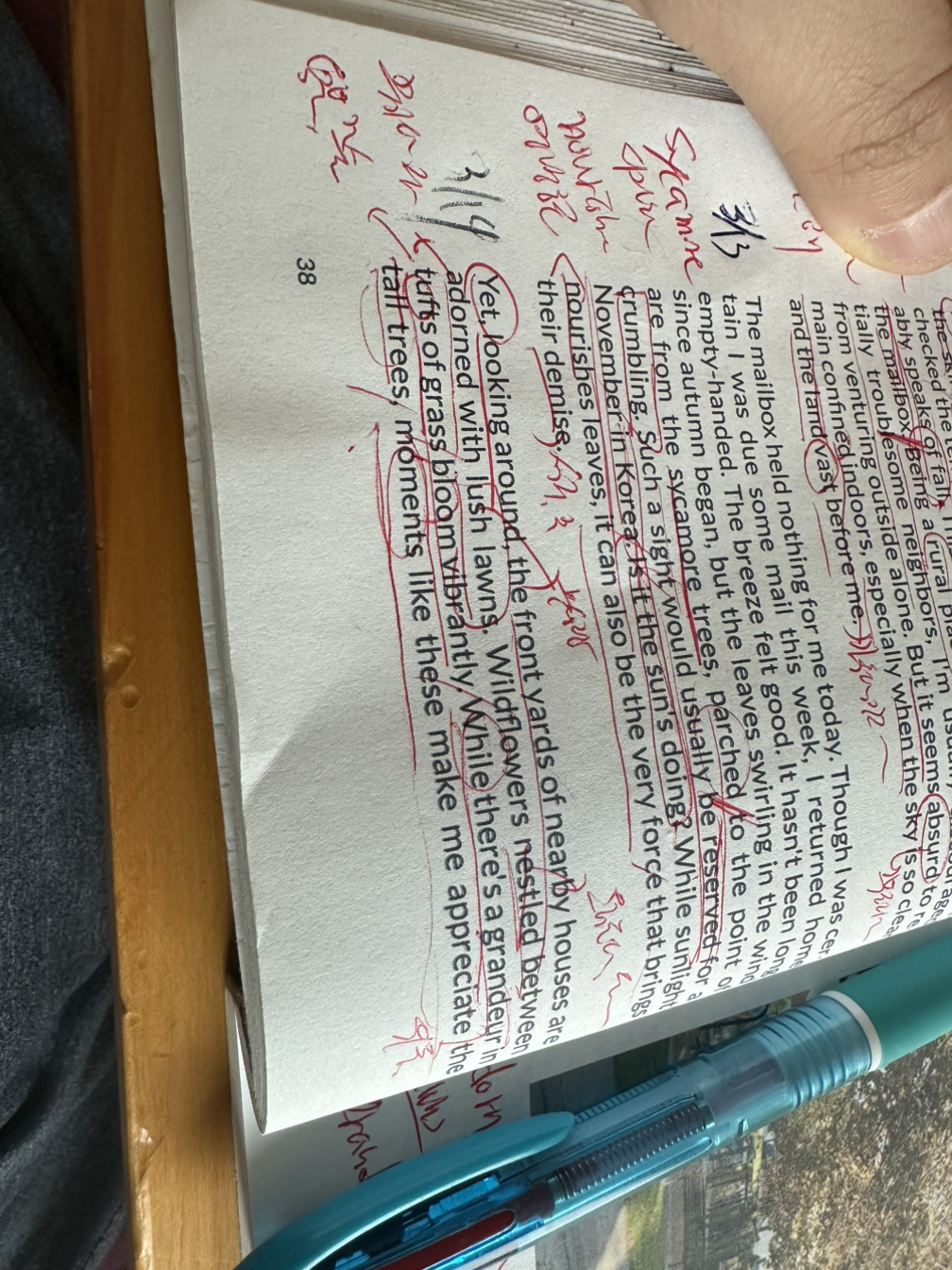 Yet, looking around, the front yards of nearby houses are adorned with lush lawns. Wildflowers nestled between tufts of grass bloom vibrantly. While there's a grandeur in tall trees, moments like these make me appreciate the humble weeds. They're the embodiment of tenacity, aren't they? They might not draw as much attention as the withered sycamores, scorched by the intense sun-light, but in this arid autumn, the robust and lively weeds seem far more splendid.