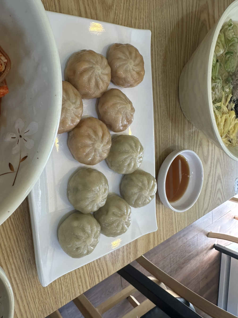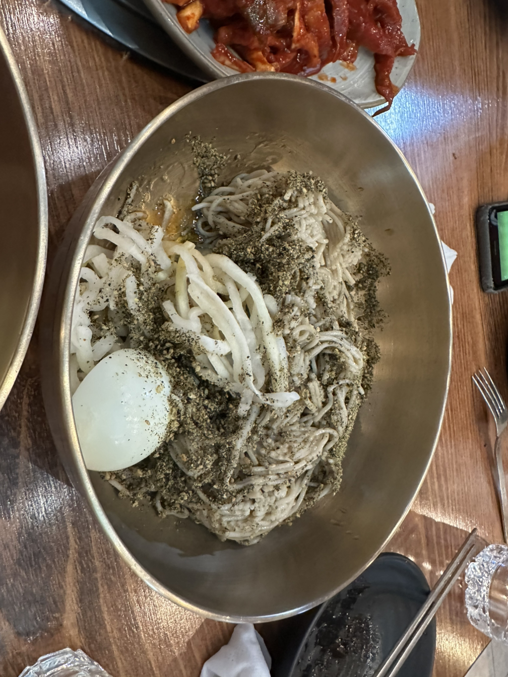 들기름 막국수 한 입 딱 먹어본 아내는 엄지를 치켜들었습니다. '바아로, 이 집이데이!! 여긴 지금껏 내가 먹어본 막국수 중 최곱니데이~' 선주후면을 늘 즐기는 저로서는, 명태회 막국수를 주문했는데, 명태회도 쫄깃하고 국수 면이 탱글탱글하게 끊기는 식감이 일품이었습니다. 시원하고 개운한 동치미 막국수야 말할 필요도 없어서 소은이는 이미 코를 박고 후룩후룩 먹고 있었지요. 그러나 아내와 나도, 이 집의 제일은, 들기름 막국수라고 생각했습니다. 안그래도 향이 가득한 들기름을 부었고, 그 위에 또 뿌린 들깨고명이 사람을 미치게 만들었습니다. 평소에 안주로는 회냉면이나 비빔냉면처럼 살짝 매콤달콤한 양념을 얹은 쪽을 즐기는 편인데, 이 들기름 막국수는 들기름 향이 아주 진해서, 공장제 소주 정도에는 결코 밀리지 않았고, 그럼에도 맛이 깔끔하고 씹는 맛이 오래 남았습니다. 거기에 곁들인 보쌈은 양이 적은게 약간 아쉽긴 했지만, 역시 약간의 명태회와 같이, 아작아작 씹히는 무말랭이에 기름기가 적절히 붙은 보쌈고기가 참으로 훌륭했습니다. 맛도 맛이었는데, 그토록 바빴음에도 위생이나 접대도 크게 흠잡을데가 없었습니다. 유일하게 재밌던 점은, 하도 바쁘시니까, 여기요~ 하기보다 Excuse~, 혹은 푸위엔~ 해야 돌아보는 중국, 혹은 백인 아가씨들이었는데, 아니 그러니까 여기가 코리아 타운이냐고요?! ㅋㅋㅋㅋㅋㅋ
