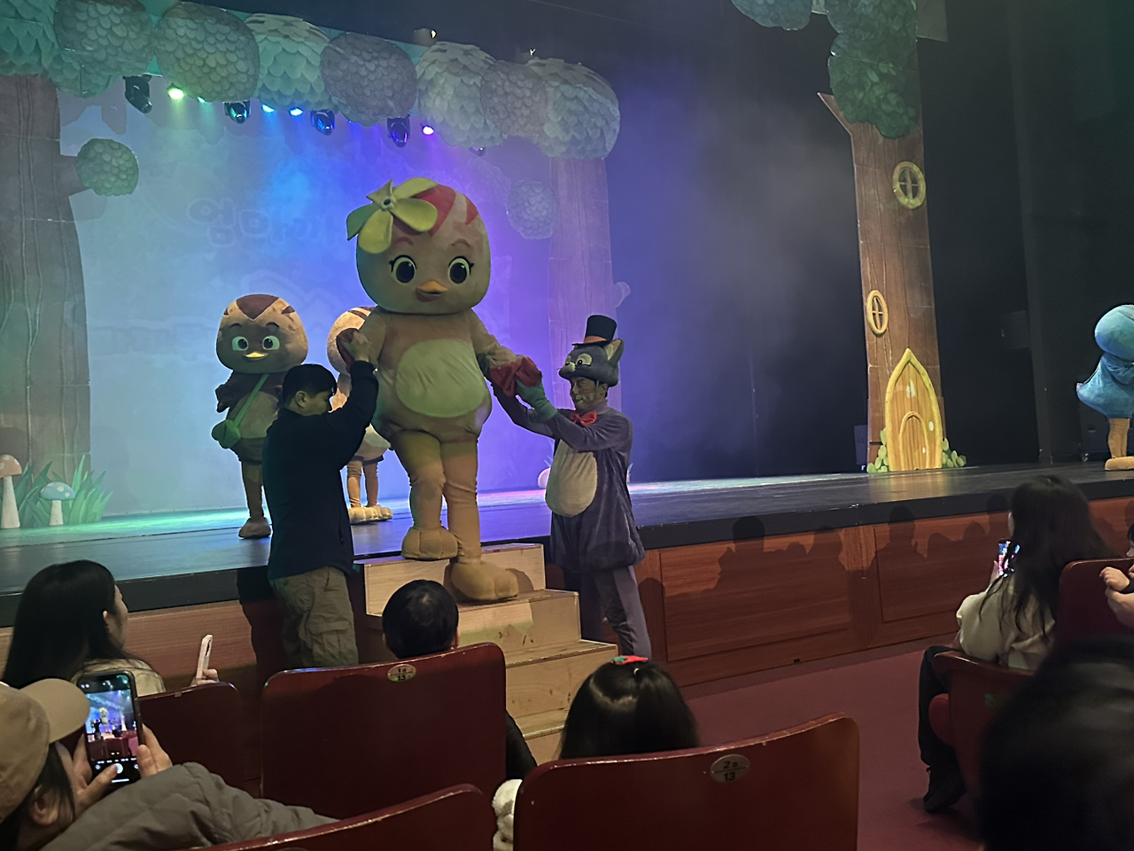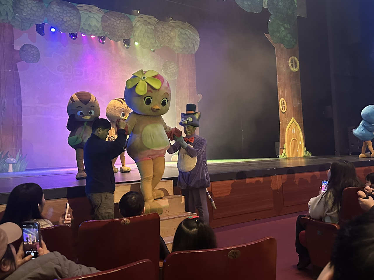 뮤지칼 공연의 서사는 간단했다. 홀로 어린 꿩들-마지, 두리, 세찌, 꽁지 등, 꺼병이 넷을 키우는 젊은 엄마 까투리는, 동네의 부탁으로 택배 일을 며칠 도와주기로 한다. 자녀들이 좋아하는 버찌를 다섯 바구니나 받기로 했으니, 자녀들이 좋아하리라는 부모 마음이 그렇다. 그러나 애 넷 키우기도 힘든데, 거기다 갑자기 안해본 일까지 하려니, 처음 결심과 달리 아침에는 출근하느라 허둥대서 안아주거나 뽀뽀도 제대로 못해주고, 아이들이 손꼽아 기다리는 집에 들어와서는 잠만 자기 일쑤다. 어린 아이들이 주로 보는 뮤지칼이라 이러한 갈등과 위기 장면이 길거나 크지는 않았고, 가족간의 화합으로 잘 마무리되었다. 뽀로로 뮤지칼과 비교해볼작시면, 관람 연령대가 달라서일지는 몰라도, 무대 연출은 비슷비슷했으나, 배우들의 역량은 좀 차이가 있었는데, 엄마 까투리 쪽의 배우들이 좀 더 관록이 있어보였고, 춤이나 가창력도 훨씬 좋아서 어른들이 보기에도 나쁘지 않았다. 다만 공연시간은 1시간 남짓. 이후 어린이 관객들과 인사하며 관람석 한바퀴 도는 시간 포함해도 1시간 30분 이 채 안되니, 시간은 약간 짧은 편이다.