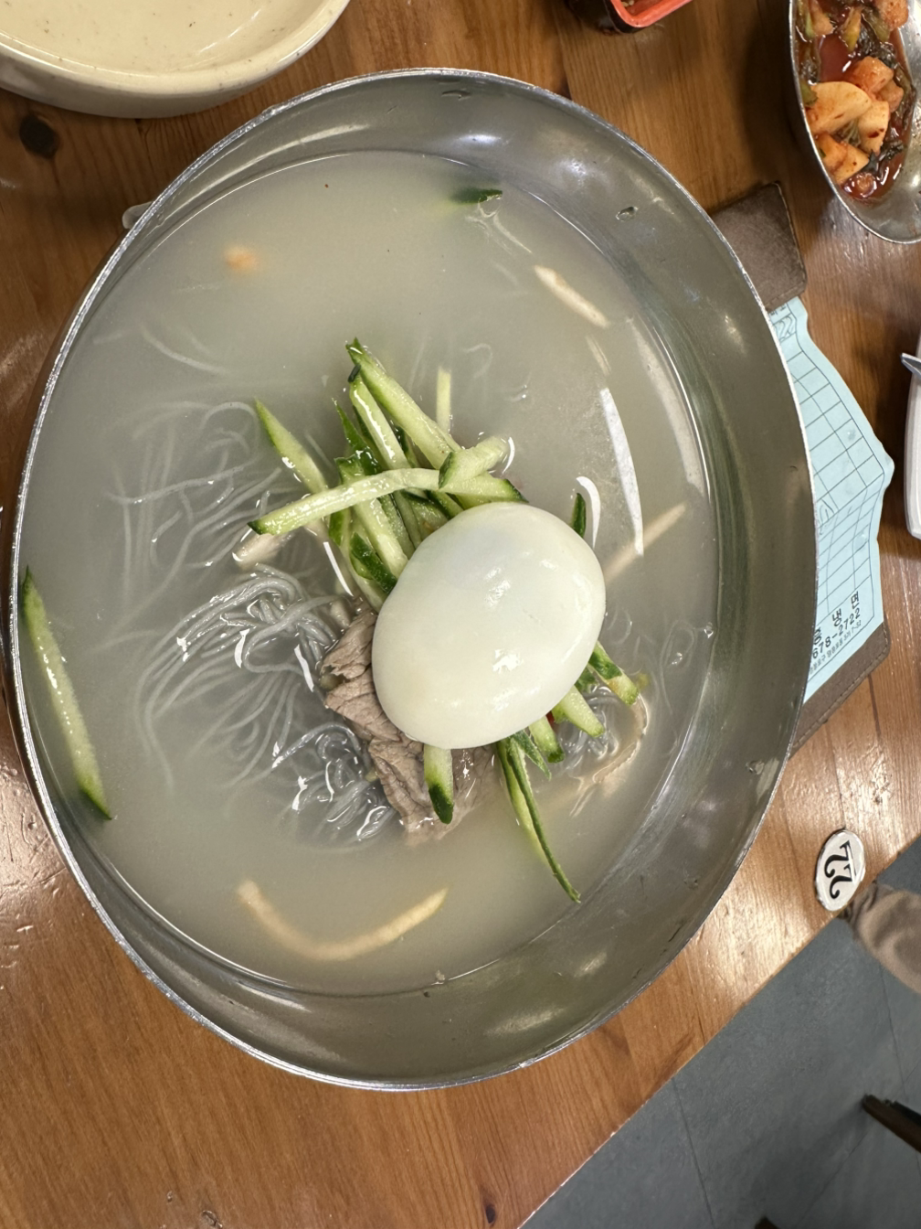널찍한 가게 안에 육수 향이 확 끼치고요, 자리는 빈틈없이 채워져 있는데, 1인석, 2인석도 제법 있습니다. 빨간색 함흥냉면이 너무 매워보이기도 하고, 일단은 물냉면 파이긴 해서 저는 물냉면을 주문했지요. 고민하다가 만두도 하나 주문하긴 했는데요, 당시에는 감량 전인데 뭘 그렇게 걱정했을까요? 다름 아닌 가격이었습니다. 저는 아내가 허락해준 카드만 쓰는데요, 사실 아내가 별말하진 않지만, 안그래도 주말 부부인데 가끔 제가 평일에 쉬는 날이면 우리 남편 어디서 뭐하나, 안 그래도 술 좋아하는데 혹시나 행여나 어디서 뭐 안 좋은 일이나 안할까 걱정하지 않겠어요? 그래서 스스로 아내가 궁금해하지 말라고 아내가 준 카드로 하루를 생활합니다. 아내나 나나 크게 잔재미가 없는 사람이라 하루 지출이 그리 크지 않고, 금액이나 위치만 봐도, 서로 '아 , 무엇때문에 뭐 샀겠군.' 할 정도인데, 냉면 한그릇 값이, 솔직히 그냥 도로 나갈까 싶을 정도로 만만치 않았어요. 거기에 만두까지 하려니, 이거 이래도 되나... 할 정도였죠. 맛있으면 다음에 처자식이랑 같이 오는 조사 비용 정도 하자는, 스스로 약간 변명 같은 위안을 하면서 먹었습니다. 음식은 빨리 나왔어요.