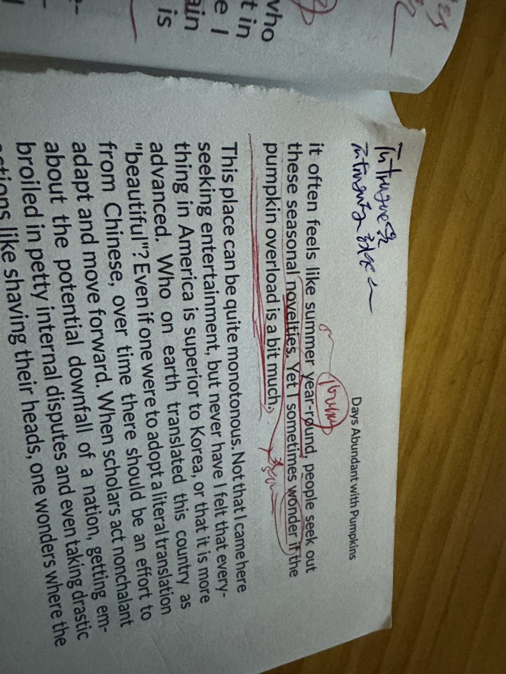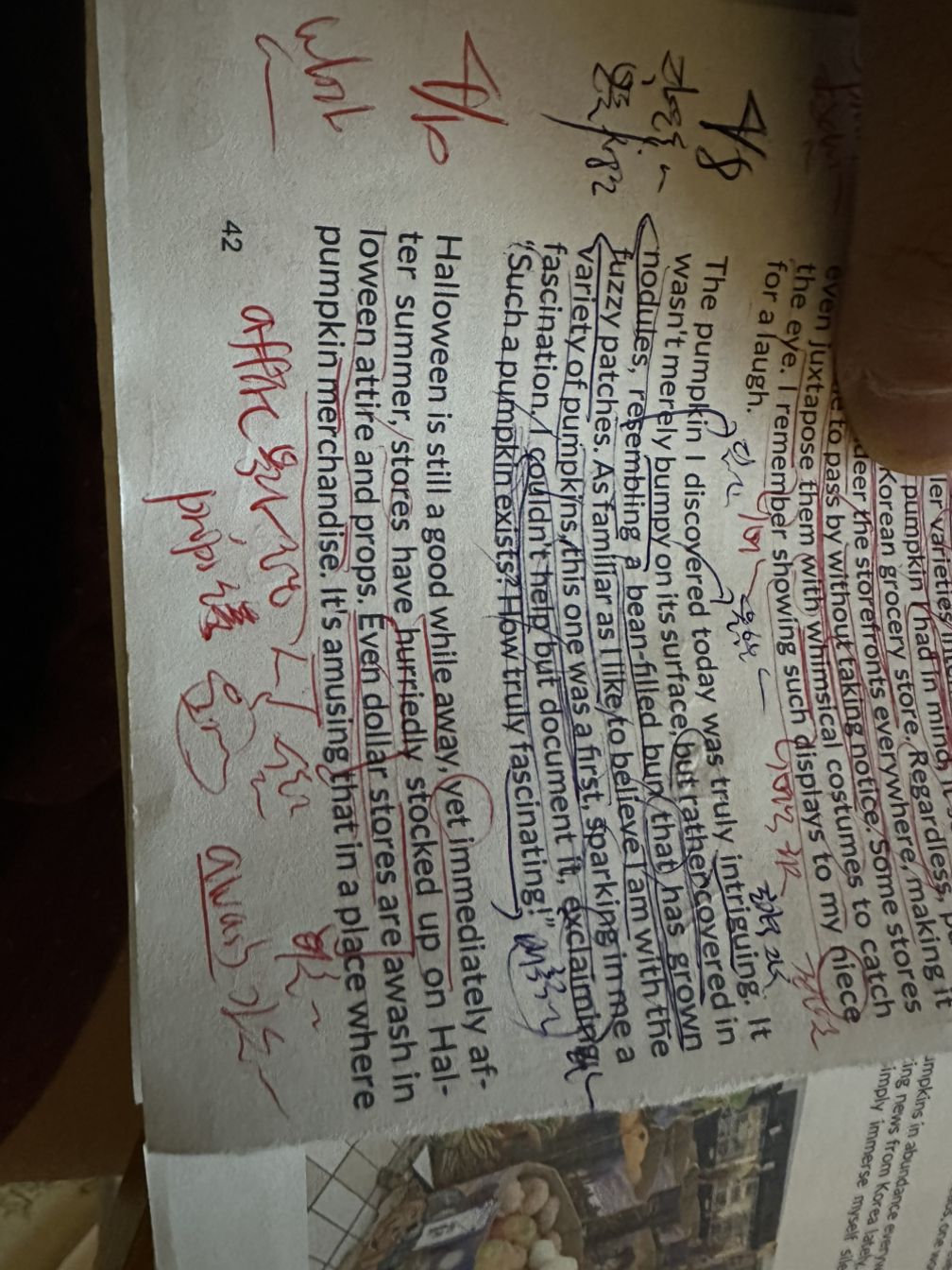 할로윈은 아직 오려면 한참.멀었어도 여전히 좋은 명절이지만, 그럼에도 불구하고 여름이 끝나자마자 가게들은 서둘러 할로윈 복장과 소품을.쌓아놓았다. 심지어 가격이 싼 구멍가게들조차 호박 상품들로 가득 차 있다. 때때로 일년 내내 여름인듯한 기분을 주는 장소에 사람들은 계절이 바뀌는 참신함을 찾으려 애쓰는데, 그런 점이 즐겁다. 그럼에도 불구하고 나는 호박에게 너무 무거운 짐을 지워진건 아닌가 가끔 궁금하다.