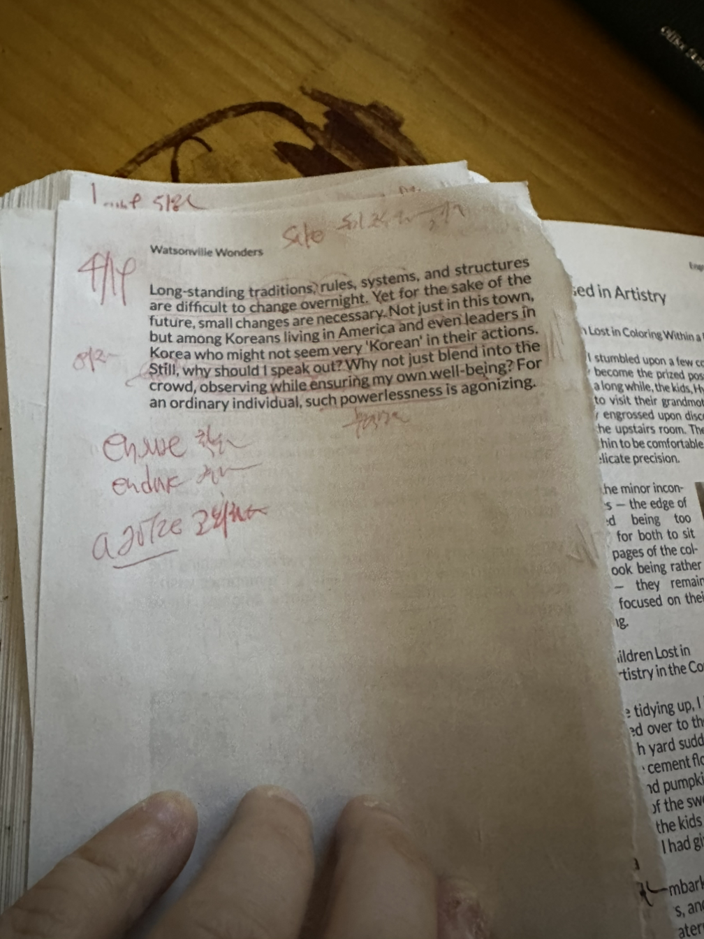 오랜 전통, 규칙, 제도, 구조는 하루아침에 바꾸기 어렵습니다. 하지만 미래를 위해서는 작은 변화가 필요합니다. 이 마을뿐만 아니라 미국에 사는 한인들, 심지어 행동이 그다지 '한국인'처럼 보이지 않을 수 있는 한국의 지도자들 사이에서도 마찬가지입니다. 그럼에도 불구하고 왜 제가 목소리를 내야 할까요? 군중 속에 녹아들어 제 자신의 안녕을 지키면서 관찰하는 것은 어떨까요? 평범한 개인에게는 이러한 무력감이 고통스럽습니다.