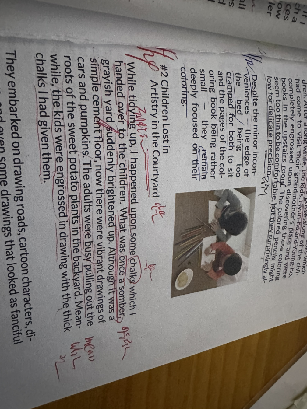 While tidying up, I happened upon some chalks which I handed over to the children. What was once a somber, grayish yard suddenly brightened up. Although it was a simple cement floor, now there were vibrant drawings of cars and pumpkins. The adults were busy pulling out the roots of the sweet potato plants in the backyard. Meanwhile, the kids were engrossed in drawing with the thick chalks I had given them.