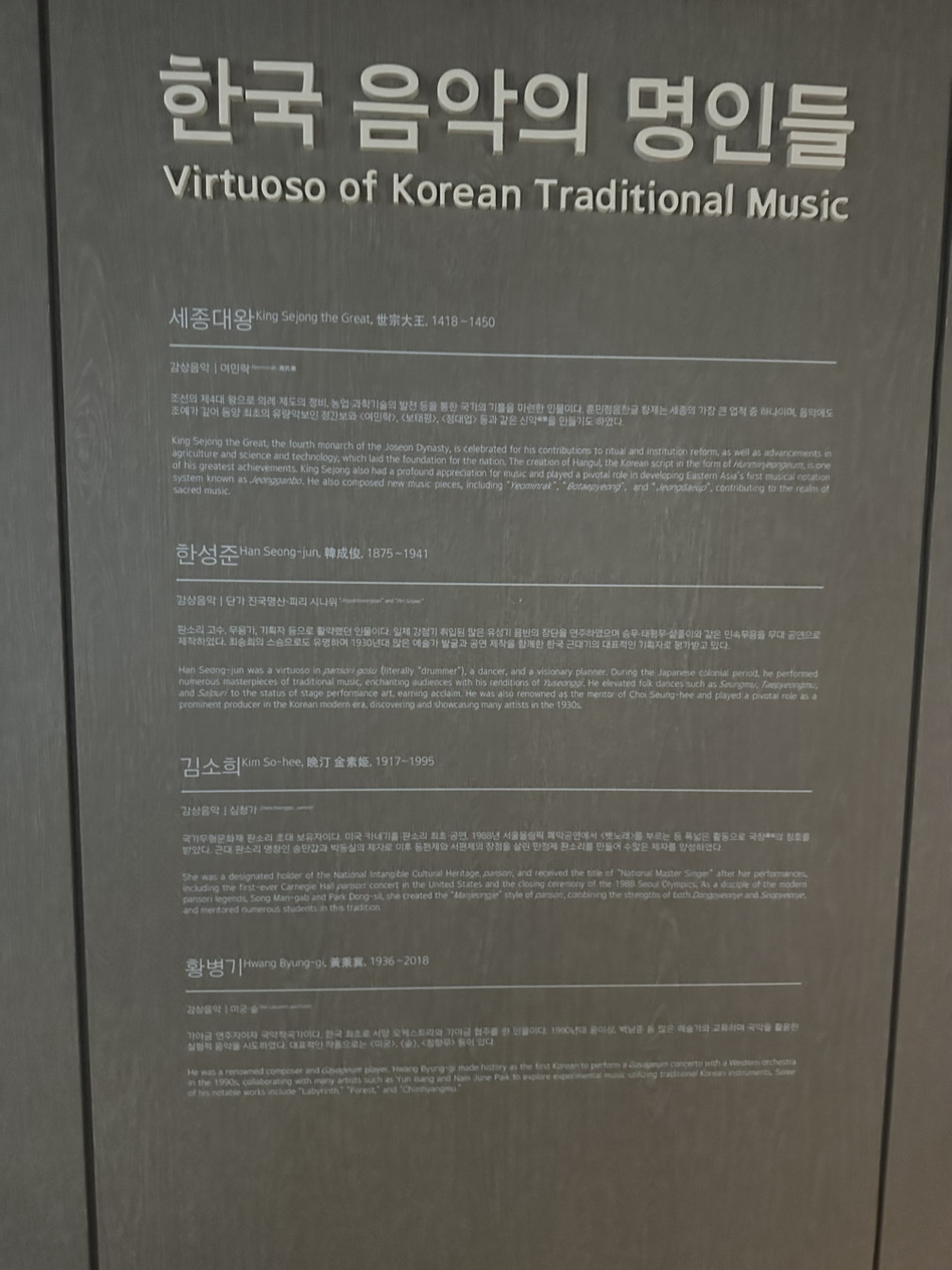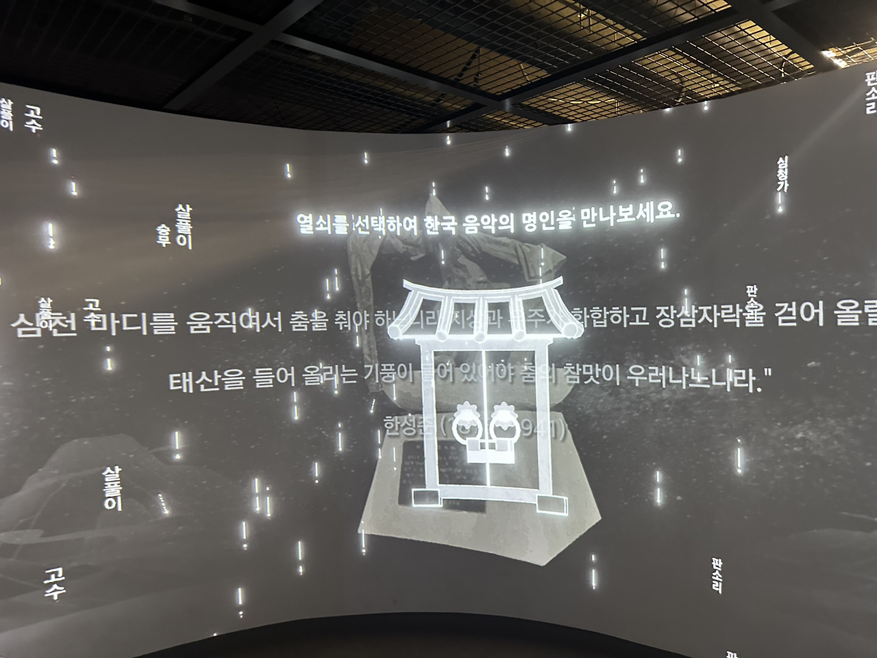 국립국악원에 대해서는 추후 더 할 이야기가 있겠으나, 참말 좋았다. 그 어떤 박물관보다도 가장 국악에 쉽게 녹아들수 있도록, 설명도 세세했고, 접근 방식도 쉬웠다. 내가 가장 폭 빠졌던 곳은, 국악 명인들의 작품을 들을 수 있는 조그마한 방이었다. 반구형의 벽에 둘러싸여, 누구도 모를수 없는 세종대왕, 그.유명한 미궁의 황병기 선생 이외에도 김소희 명창과 한성준 선생의 음악까지 들을 수 있었다. 혹시나 음악 들으며 눈 둘 곳이 없을까봐 주변 풍경까지 세심하게 바꿔줘서, 정말로 산책하듯 걸으며 음악을 즐길 수 있었다.