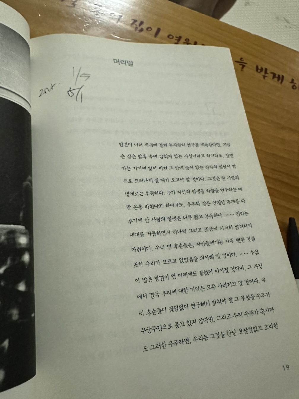 소은이가 나오기를 기다리며, 끄적였던 흔적들이 책의 곳곳에 남아 있었다. 그 이전에 몇번 읽으려.시도했으나 소은이 태어난 이후 완독은.하지.못했다. 이제서야 다시 마음을 잡고 읽는다. 우주는 나와 연결되어 있겠지만, 내가 직접 겪을수 없는 은유이고, 과학은 그를 읽어내는 문법일.터이다. 다시 이제 조금씩 시작할 때가 되었다.