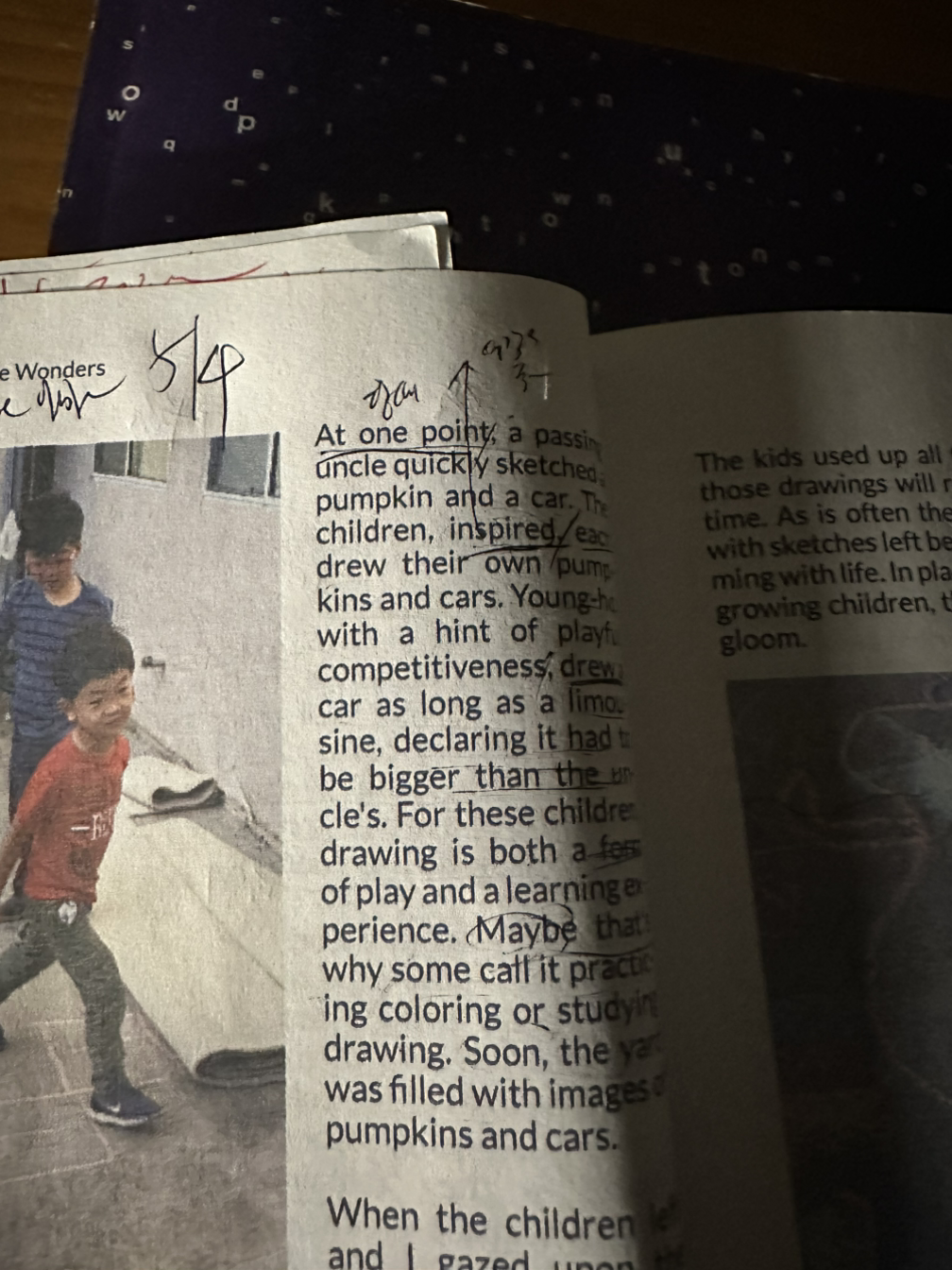 어느 순간 지나가던 삼촌이 호박과 자동차를 재빨리 스케치했습니다. 아이들은 영감을 받아 각자 호박과 자동차를 그렸습니다. 영호는 장난기 가득한 경쟁심으로 리무진만큼 긴 차를 그려내며 삼촌의 차보다 커야 한다고 선언했습니다. 이 아이들에게 그림은 놀이의 한 형태이자 학습 경험입니다. 그래서인지 색칠 연습이나 그림 공부라고 부르기도 합니다. 곧 마당은 호박과 자동차의 이미지로 가득 찼습니다.