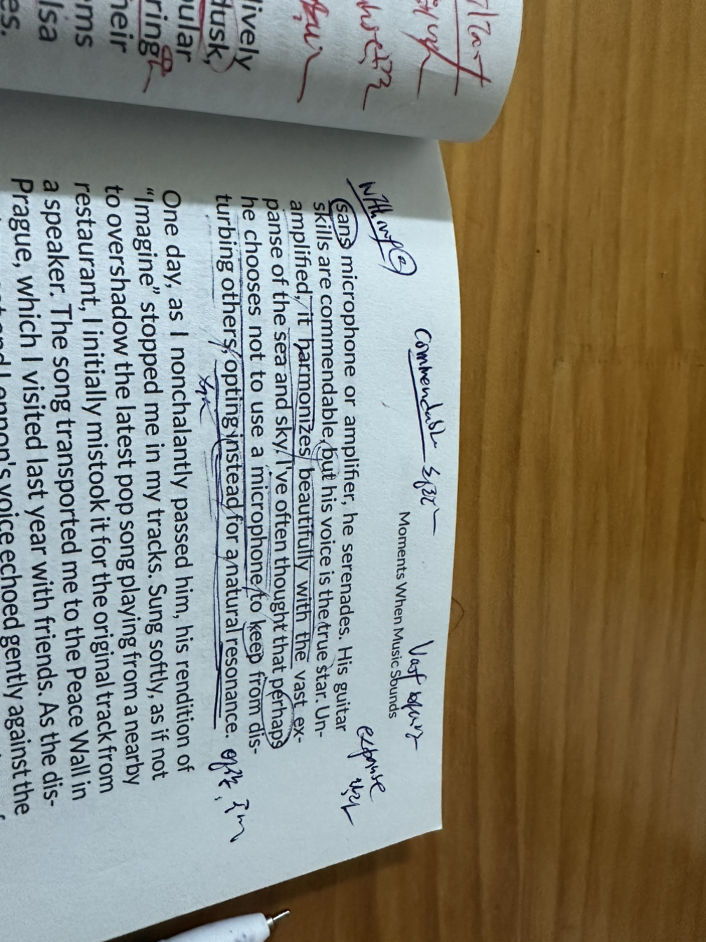 오직 기타만.가지고, 마이크도 증폭기도 없이, 그는 감미롭게 노래했다. 그의 기타 치는 솜씨는 칭찬해줄만 했지만, 그의 목소리는 진실로 예술적이었다. 증폭되지 않고도, 그 조화는 아름답고.방대하게 하늘과 바다로 퍼졌다. 나는 때때로 그가 다른 방해를 받으면서도 마이크를.쓰지 않는 이유는, 이 자연스러운 울림을 위해서인가.싶었다.