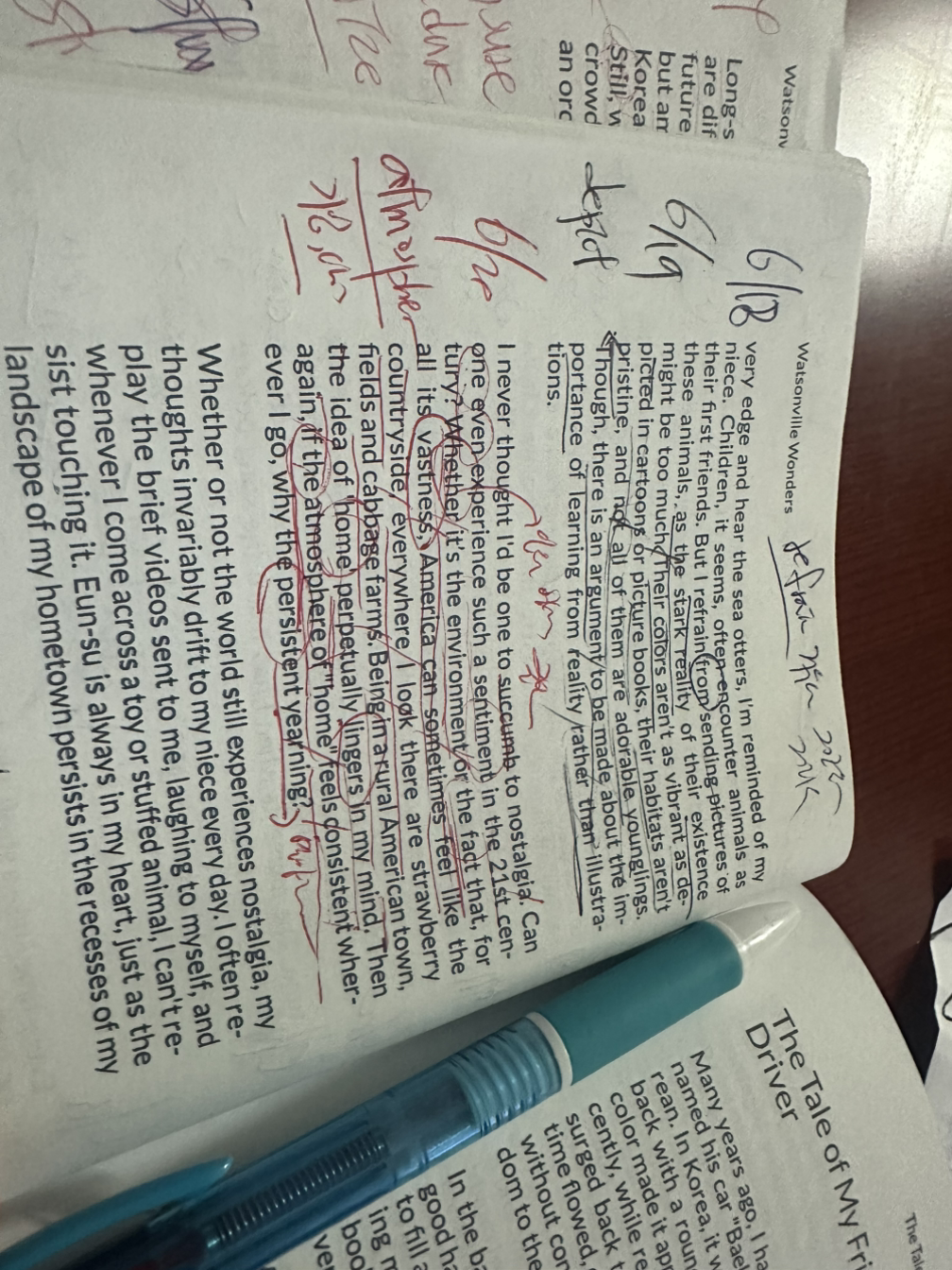 나는 내가 향수병에 굴복하는 사람 중 한 명이 될거라 생각해본적이 없다. 21세기에 이러한 우울함을 겪을수 있을까? 환경 때문이든, 아니면 미국이 너무 광활하다는 사실 때문이든, 모든 곳에서 딸기농장과 양배추 농장 을 볼수 있는 미국은 때때로 꼭 시골 변두리처럼 느껴질수있다. 미국의 지방도시에 있으면, 집 에 대한 생각은 영구히 내 마음에 남아 있다. 그러면 다시, 내가 가는곳마다 집의 분위기가 계속 느껴지기 때문에 지속적으로 집을 열망하게 되는 것일까?