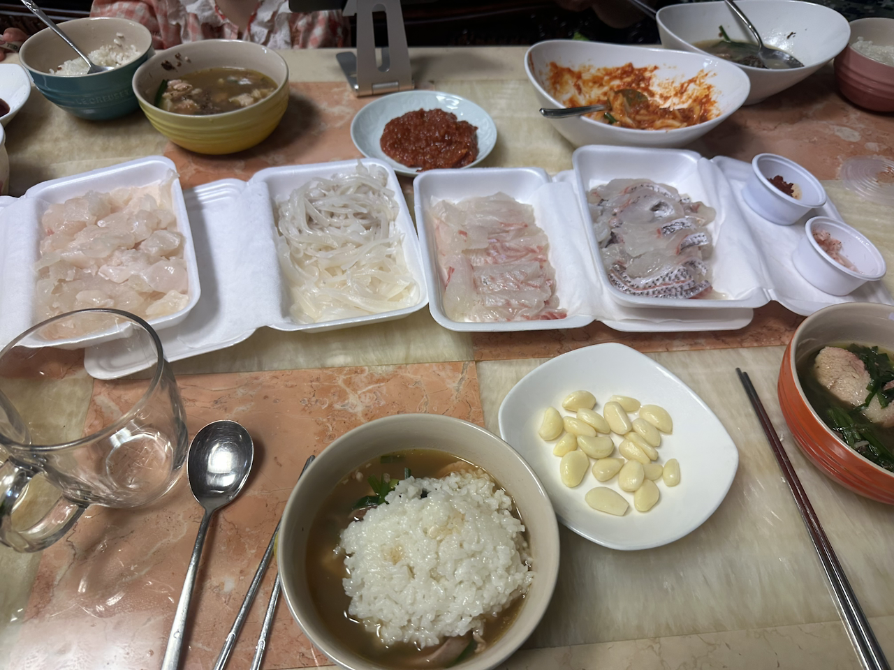 금요일 오전 훈련을 다 못 하고 서둘러 처가에 갔더니 아버님은.사위 왔다고 회 4종류(!)에 장어(!!)에 장어묵(!!!)에 돼지국밥(!!!!)까지 그야말로 푸산 풀코스를 싸오셨다. 덕분에 처가에서 저녁부터 허리띠 풀어놓고 회에 국밥에 아침부터 장어 굽고 별 호사를 다했다. 이토록 배터지게 먹었으니 어찌 몸을 풀지 않을수 있는가. 소은이도 얼마나 배불리 먹었는지, 어제 오랜만에 외가 와서 늦게 잔 것까지 겹쳐 웬일로 아침부터 다시 잠을 잤다. 그래서 아버님은 꽤 재밌을듯하다며 티비에 전화기 연결해서 케데헌(!) 보시는 동안, 사위는 한쪽 방에서 조용히 문 닫고 7킬로 아령으로 연습했다.