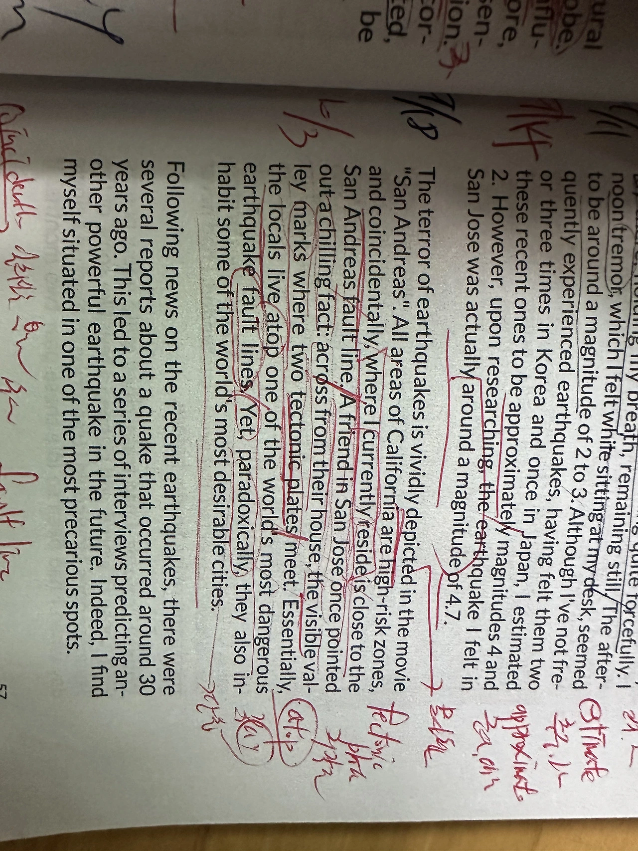 싼 호세에 있는 한 친구는 써늘한 사실을, 지적해버리었다. 그들의 집 건너편에 시각표지판이 있는 쪽에 두 개의 지각판이 만난다는 점이다. 중요한 점은, 그 지역의 꼭대기에 가장 위험한 단층 지진대가 있다는 사실이었다. 그럼에도 불구하고, 역설적으로 그들은 가장 세계에서 욕망을 자극하는 도시에 살고 있기도 하다.