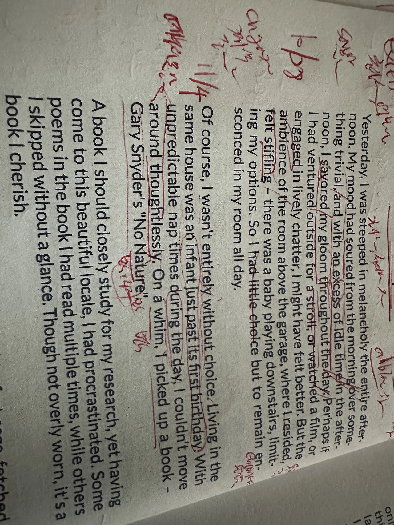 Of course, I wasn't entirely without choice. Living in the same house was an infant just past its first birthday. With unpredictable nap times during the day, I couldn't move around thoughtlessly. On a whim, I picked up a book - Gary Snyder's "No Nature".