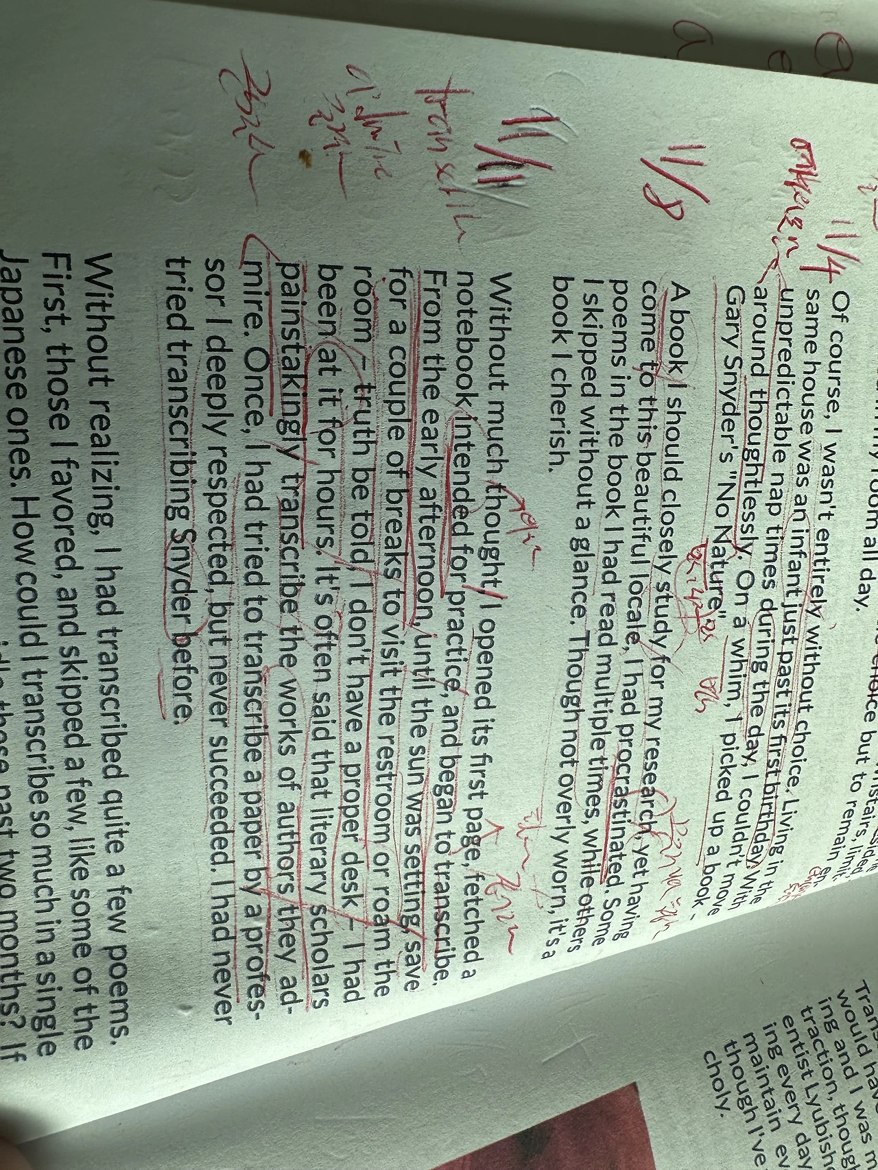 Without much thought, I opened its first page, fetched a notebook intended for practice, and began to transcribe. From the early afternoon, until the sun was setting, save for a couple of breaks to visit the restroom or roam the room - truth be told, I don't have a proper desk - I had been at it for hours. It's often said that literary scholars painstakingly transcribe the works of authors they admire. Once, I had tried to transcribe a paper by a professor I deeply respected, but never succeeded. I had never tried transcribing Snyder before.