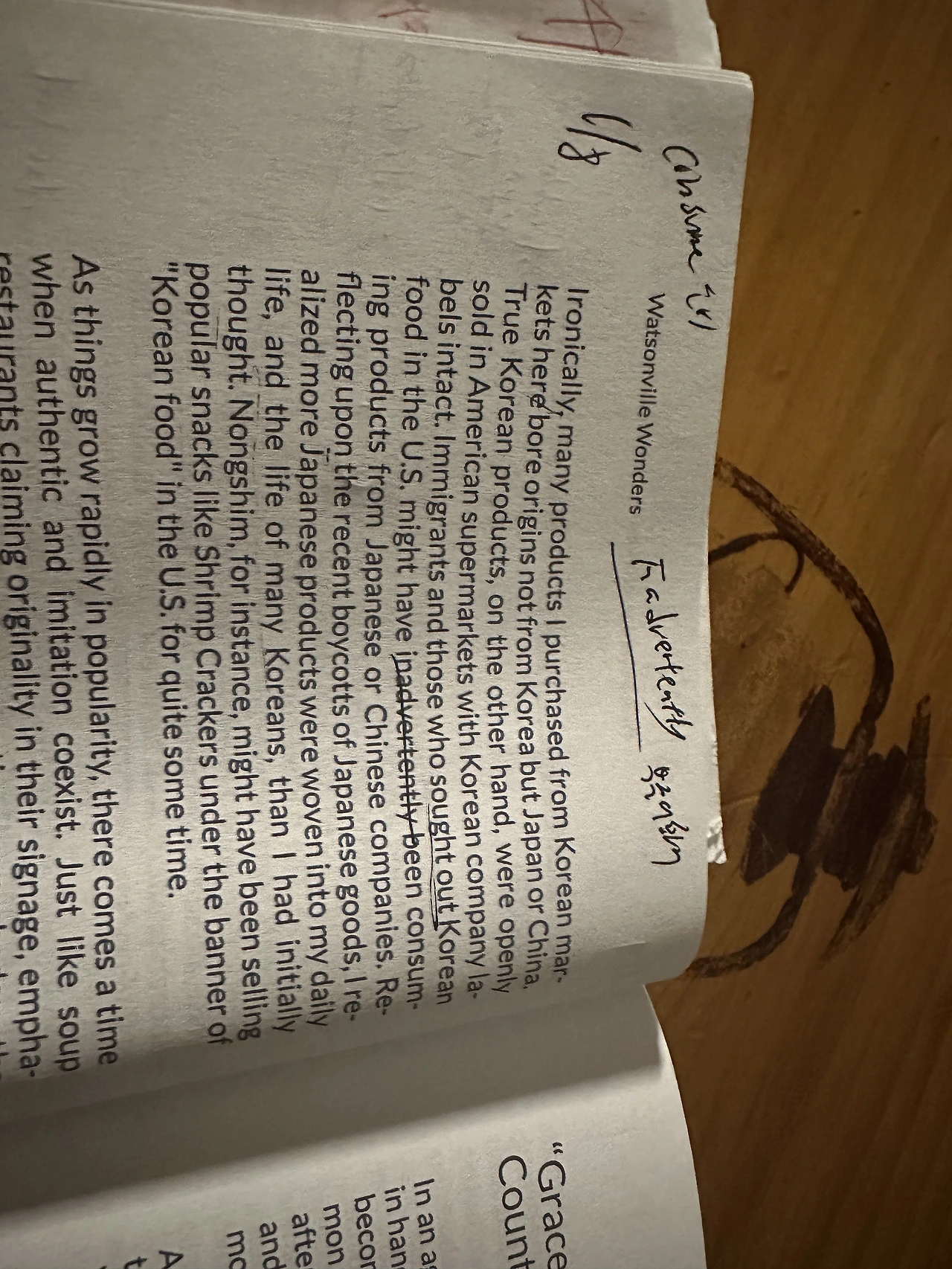 모순적이게도, 내가 이 곳에 있는 한국 상점에 구매한 많은 상품들이 한국 본토에서 만들기보다는 중국이나 일본에서 만들어진 경우가 많았다. 오히려, 진짜 한국산은 미국 상점에서 한국 회사의 미개봉 딱지를 붙인 채 공개적으로 팔렸다. 이민자들이나, 혹은 미국에서 한국 음식을 찾아헤매던 사람들은, 무심코 일본이나 중국 회사에서 만든 물건들을 사왔을지도 모를 일이다.