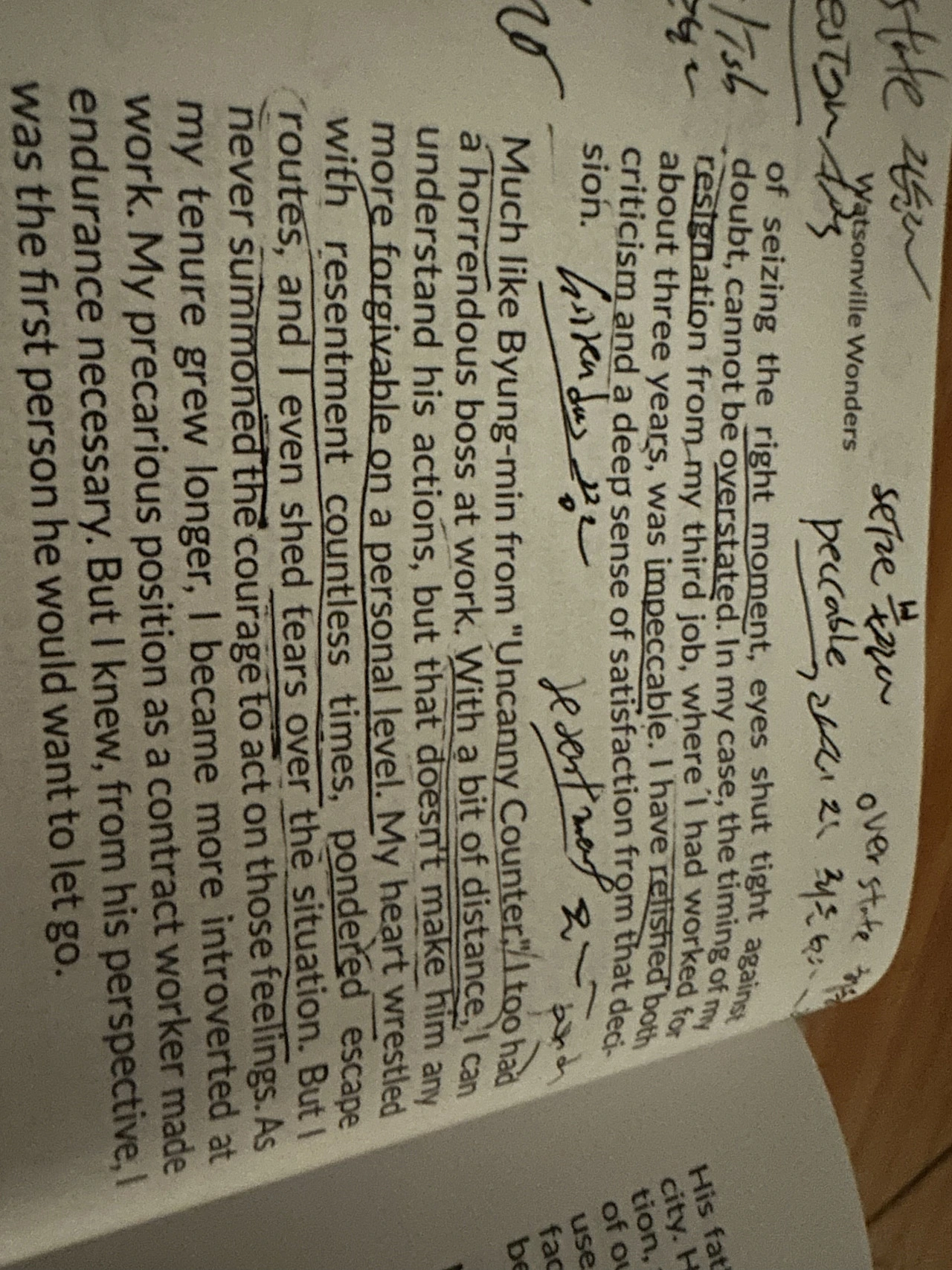 ‘경이로운 소문’ 의 병민과 아주 비슷하게, 내게도 너무너무 끔찍한 직장 상사가 있었다. 거리를 조금 두고 보면, 그의 행동을 이해할순 있었찌만, 그렇다고 사적으로 용서할 마음까지는 들지 않았다. 내 마음은 셀수 없이 많은 원한에 엉켜 있었고, 늘 탈출할 방법만을 궁리했고, 급기야 이러한 상황에서 눈물까지 나올 지경이었다.