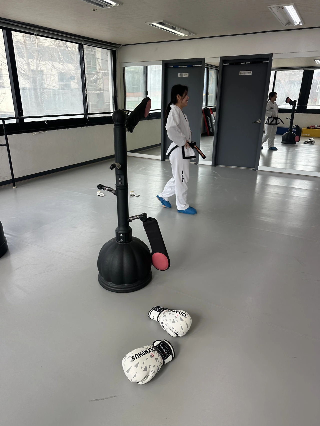 오랜만에 손발을 맞춰본 열혈 부사범님은, 정말로 이동이 많이 늘었다. 나도 한때 나의 보법과 발차기부터 다시 잡으려고, 옥상도장에서 발바닥이 찢어지도록 버티고, 걷고, 뛰고, 미끄러져가며 연습한 적이 많다. 열혈 부사범님은, 젊고, 재능이 있으며, 사범님꼐 가장 가까이서 가장 오래 배운 실력자다. 국내외 여성 선수들 중 상위권에 있다 할만하며, 특히 틀 연무는 사범님과 가장 흡사한 느낌이 난다. 허공에서 맞서기 연습을 혼자 할때는, 그야말로 무협지 여주인공처럼 양손발을 그림처럼 뿜어내고 거두는, 황홀한 실력을 지니고 있지만, 그 동안 맞서기에서 항상 고전을 면치 못한 이유는, 체중과 경험이 부족하고, 나처럼 거리를 둘 수 없는 사람이 밀고 들어올때 제대로 이동하지 못해서였다. 그런데 그 날 아침의 열혈 부사범님은, 정말로 전후좌우로 빠르게 잘 움직였다. 나도 그동안 놀지 않았으므로, 마찬가지로 열혈 부사범님을 쫓아다녔는데, 기술 싸움을 하면, 당연히 내가 질 수밖에 없으므로, 열혈 부사범님이 나를 공격할 수 없는 거리로 내가 몰아넣는데 시간이 오래 걸렸다. 한 지점에 도달하면, 열혈 부사범님은 번개같이 빠르게 움직여서 치고 빠졌으므로, 나는 결국 옛날 권투하던 방식으로 양 어깨를 사용해서 열혈 부사범님을 도장 구석에 몰아넣고 나서야 비로소 타격을 넣을 수 있었다. 그래도 둘다 검은띠라고, 무작정 치고 받기보다는 수싸움이 되었는데, 앞서 말했듯, 내가 쓸 수 있는 기술이 열혈 부사범님보다 현저히 적었으므로, 나는 어떻게든 내 거리에서 열혈 부사범님을 놓치지 않으려고 악착같이 따라다녔다. 팔다리가 짧은 근거리 타격가에게, 경기 끝까지 쫓아다녀야하는 체력, 끈기, 인내심은 정말 소중한 것이다. 열혈 부사범님은 오전에 이렇게 땀을 흘릴 줄 몰랐다며 새초롬하게 웃었다. 뱁새가 황새 실컷 쫓아다니다 끝났지만 모처럼 더욱 즐거운 훈련이었다.