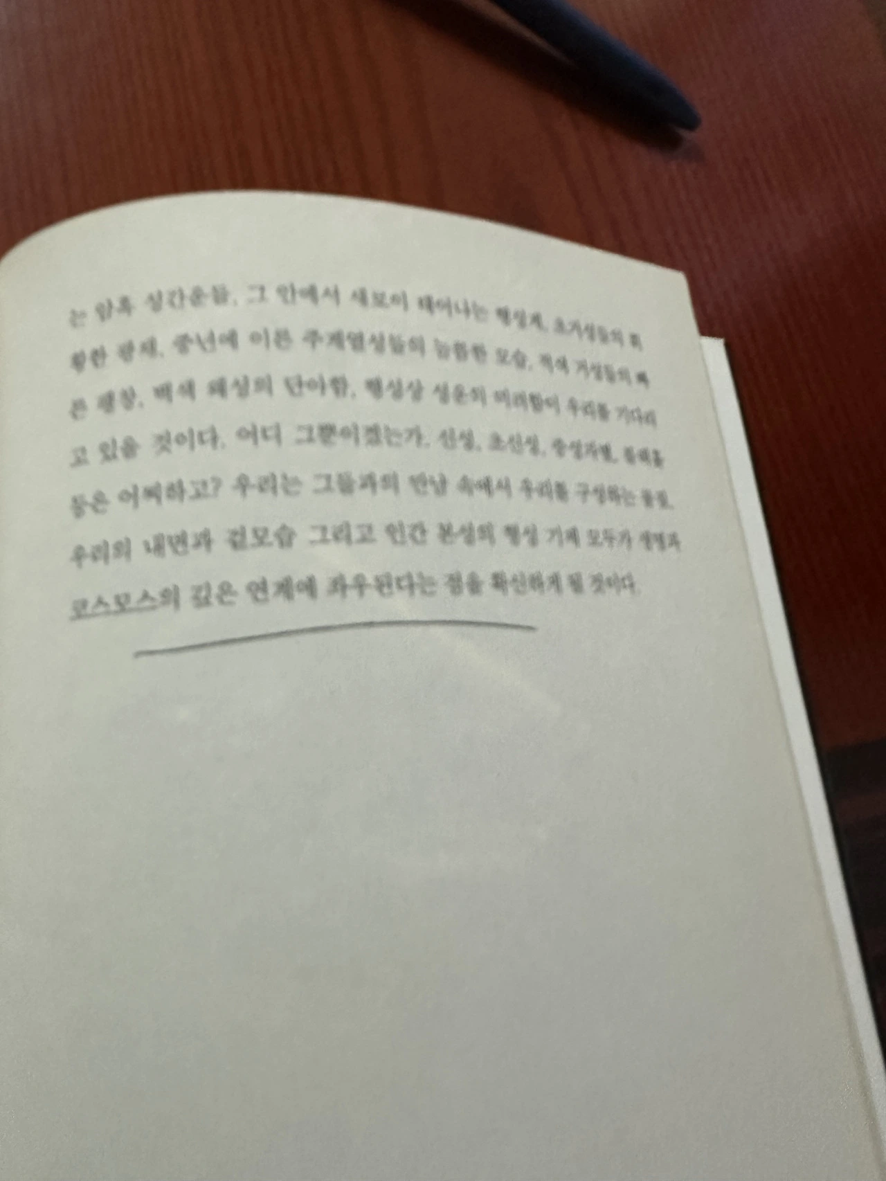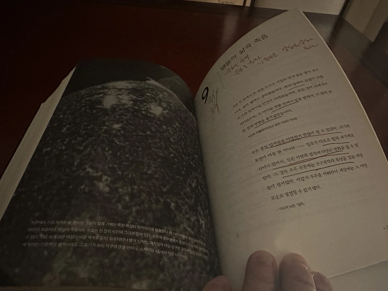 그나마 이해한 내용이 이 정도이다. 이 다음을 대별해서 미스타 세이건은 세계관을 확장시켜 저 멀리 우주로 나아가는데, 별들의 원자와 분자가 어쨌다는 건지, 태양의 헬륨이 늘어나서 어쩌겠다는건지, 이러한 내용이 대체 우리 삶에는 어떤 영향을 준다는 건지 나는 솔직히 제대로 이해할수 없었다. 소은이가 태어났을떄, 처음으로 코스모스를 읽던 무렵에도, 이 부분도 밑줄 긋거나 간략하게 적어놓은 내용이 거의 없다시피 한걸 보니, 7년전이나 지금이나 이 부분부터 나의 이해도가 더욱 떨어지기 시작한 모양이다. 물론 태양이 없으면 지구도 없으니 이 모든 우주의 조화가 당연히 우리의 삶에도 영향을 주겠지만, 미국과 이란의 전쟁, 러시아와 우크라이나 간의 전쟁조차 떄때로 실감나지 않을떄가 있듯, 코스모스의 글들은 늘 내게는 너무 아득하게만 느껴진다.