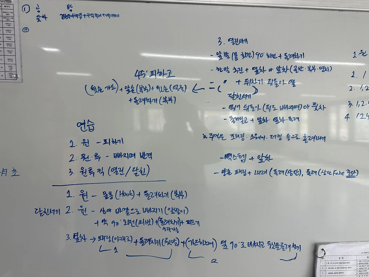 나는 그동안 맞서기 연습을 하면서 강한 힘으로 버텨가며 쳐보려고도 하고, 빠르기를 높여서 먼저 쳐보려고도 하고, 짧고 허약한 몸을 보완하기 위해 나름대로 고민을 많이 한 편이었다. 한동안 힘을 키우려고 애쓰다가 , 젊었을적 관절기에 다친 발목과 무릎 말고도 어깨, 손목, 팔꿈치까지 삐걱거리기 시작하면서 힘을 키우는 훈련을 줄이고, 가능한 빠르기와 보법, 체력, 특히 발차기를 중심으로 기술 등을 더 많이 연습하려고 늘 노력중이다. 그러므로 나는 요즘 늘 쓰던 정형화된 방어와 공격의 자세가 아니라, 손발을 비교적 자유롭게 두고 가능한 빨리 치고 걷어내는 자세를 쓰고 있다. 사실 요즘 주로 연습해주시는 김 선생님이 워낙 팔다리가 길고 빠른 분이라, 내게도 많은 도움이 되고 있다. 쿠도 형님은 제일 재미있는 장면이라며 한참 보시다가 여러 조언을 해주고 가셨다.