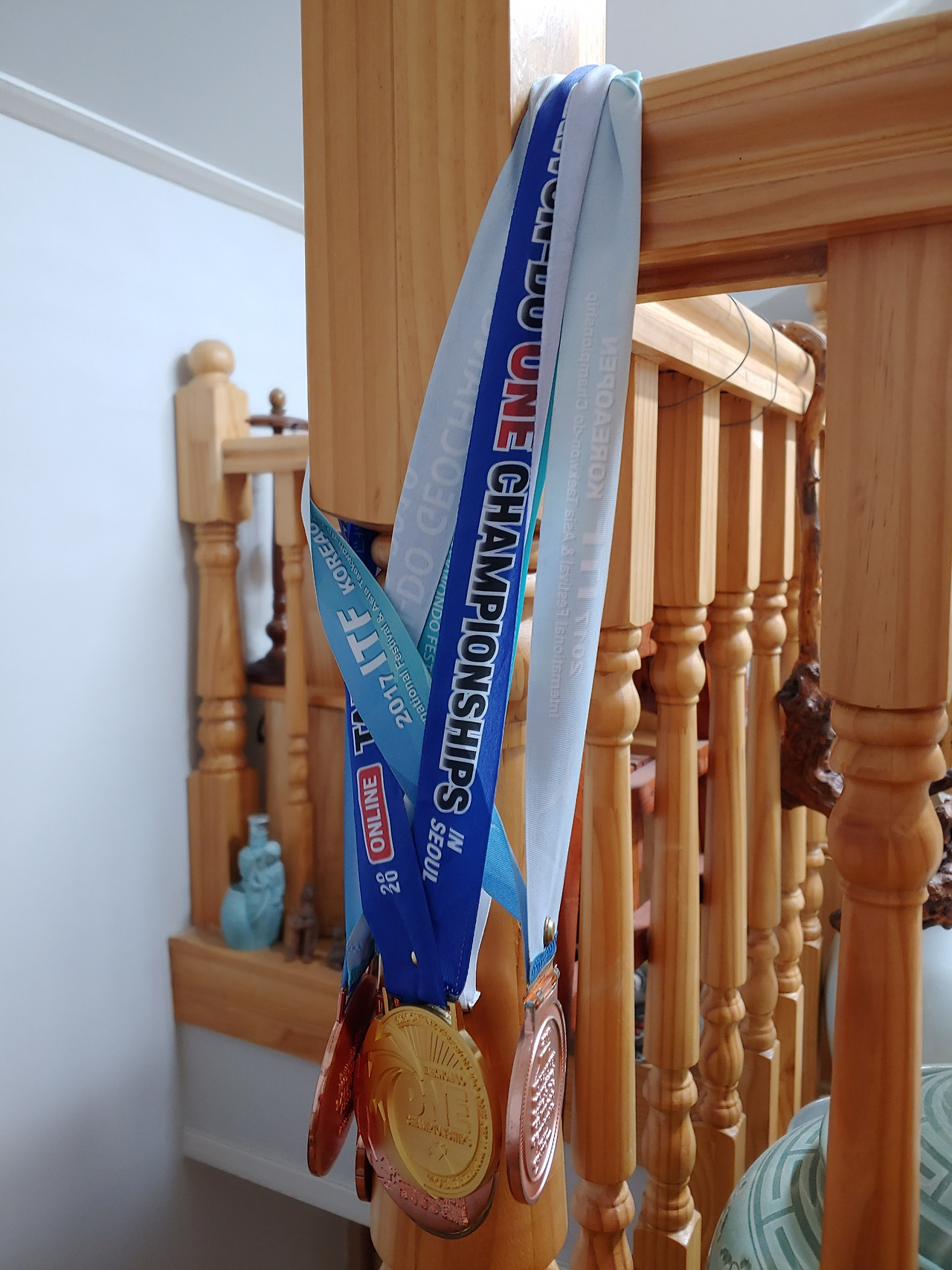 모처럼 도장에 다녀온 날, 대회 당일 못 받은 은메달 받아왔더니 침대방 계단참에 걸어놓으며 아내 왈, 아이고, 매번 동메달만 받으시더만은 언(은) 메달 받아오이까네 집이 훤하데이- 아, 예.....ㅋㅋㅋ