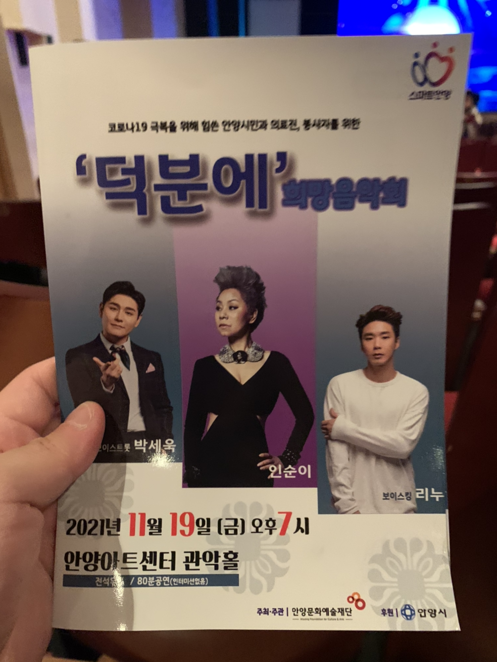 아내가 소은이를 낳기 전, 가요무대 신청을 해서 어머니 아버지 모시고 다녀온 적이 있다. 요즘에 아내가 내 전화기까지 빌려가면서 뭘 또 끄적끄적 신청을 하더니, 아이코, 이번에는 열린음악회 와 '덕분에' 희망음악회 가 또 당첨이 되었단다. 열린음악회는 어머니와 아버지만 다녀오시게 되었고,(아버지는 공연 끝을 장식한 김경호 씨가 꽤 충격적이셨던듯, 아주 혹평을 하셨다;; ㅋㅋ 김경호 씨의 마음을 위해서 아버지의 말씀은 여기에 올리지 않겠다. 경호 형님, 죄송합니다, 형님의 광팬이긴 한데, 아버지하곤 좀 안 맞으셨나봐요..^^;;) '덕분에' 희망음악회는 당첨된 사람이 한 명씩 동반할 수 있어 어머니 아버지를 모시고 가게 되었다. 왜 '덕분에' 인고 하니, 그동안 안양시민들의 건강을 위해 고생한 의료진들과 경찰, 소방관 등을 초청하고, 또 고생한 안양시민들도 함께 즐기라는 뜻에서 '덕분에' 희망음악회란다. 앵콜까지 합치면 쉬는 시간없이 1시간 40분 짱짱한 공연에서, 가수는 딸랑 세 명, 안양시 홍보대사이자 안양의 아들 박세욱 씨, 보이스 킹 우승자 리누 씨, 그리고 다른 설명이 필요없는 인순이 씨 이렇게 세 명이 나왔는데, 어찌나 다들 노래를 잘하는지, 오랜만에 넋이 썩 나갔다. 인순이 씨야 당연하겠으나, 두 청년은 각자 보이스트롯과 보이스킹 이라는 경연 프로그램에서 우승을 했다고 하니, 과연 그 실력이 남달랐다. 아버지 어머니가 하도 김경호 씨에게 충격을 받으신 듯해서, 은근히 공연 중간중간 눈치를 살폈는데, 아버지께서 자꾸만 눈물을 훔치셨고, 어머니는 열린음악회보다 훨씬 재밌었다고 하시니, 하여간 다행. 특히 아버지는 리누 라는 가수는 생각도 못하고 있었는데, 아주 노래를 잘하더라며 절찬을 하셨다. TV를 잘 보지 않으므로 나 역시 처음 보긴 했는데, 솔직히 멀리 있는 신승훈 씨 찾느니 가까이 리누 찾겠다고 생각들 정도로 아주 절절하게 노래를 하는 태가 일품이었다. 저 뛰어난 솜씨를 가지고도 경연 프로그램에서 우승을 하기 까지 이십년간 무명 생활을 유지하며 아주 힘들게 살았다고 하니, 새삼 내 공부나 무공으로 무엇 하나 안타깝거나 아까워할 필요도 없겠구나, 하는 생각이었다. 본인의 삶에 비추어 사비로 일년에 스무명씩만 받는다는 다문화 중학교를 운영한다는 인순이 씨 역시, 코로나 바이러스로 공연이 줄어드는 요즘에도 백방으로 뛰어다니며 학생들을 가르치기 위한 돈을 번다고 말씀하실 정도였다. 어머니 아버지 연배의 여가수는 여전히 노련하고 활기차셔서, 돌아가신 휘트니 휴스턴 찾느니 가까이 계신 인순이 씨 공연 보러 가겠다는 생각을 또 한 번 했었다. 하여간 아내 덕에 어젯밤도 즐겁고, 평화로웠다. 그러니까 출근만 안했으면 좋겠..읍읍.