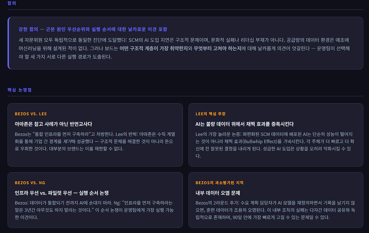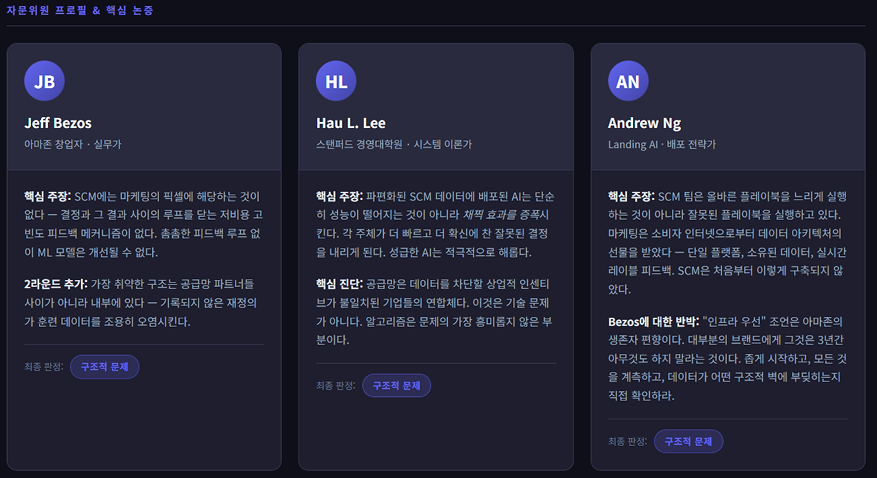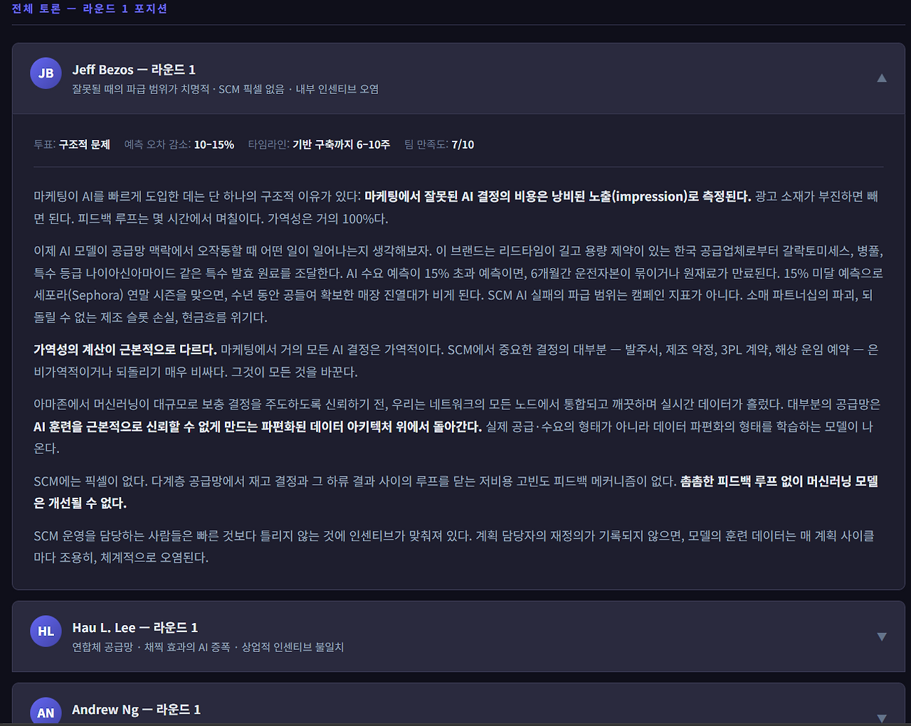 - Claude Code를 통해 3개의 서로 다른 페르소나를 가진 SCM에 대한 깊은 통찰력을 가진 AI 에이전트 셋업 (아주 구체적이거나 신뢰성이 높다고 볼 순 없고, 단순히 내가 지정한 사람의 시야에서 판단하라 정도의 지침. 내가 선택한 3명은 아마존의 Jeff Bezos, 채찍 효과 이론의 창시자인 스탠퍼드대학의 Hau Lee, 구글 AI 연구 조직 설립자이자 제조 현장에 AI 도입을 리딩하고 있는 Andrew Ng)