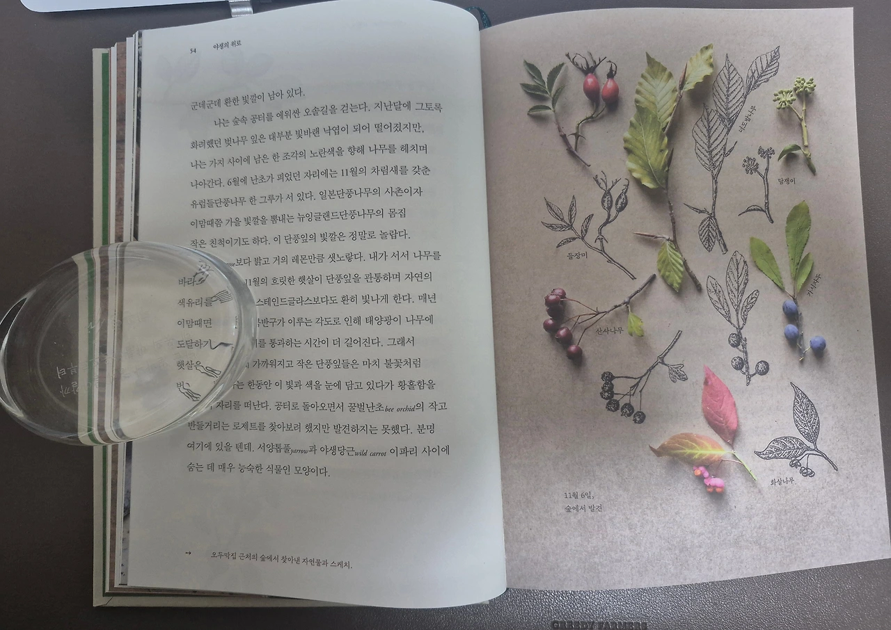 11월에는 밖으로 나서는 매번의 산책이 중요하다. 날씨가 어떻든 숲속에서 보내는 10분은 뇌 신경전달물질의 균형을 변화시켜 사고방식에 영향을 미치고 내가 일과를 유지할 수 있게 해준다. 해가 나오는 날이면 기분에 영향을 미치는 뇌 내의 화학물질이 더욱 많이 분비되고 어쩌다 어치나 뱀도랏, 나뭇잎에 앉은 뱀눈나비라도 목격하면 나는 자연 관찰자의 은은한 황홀경에 빠진다. 즉 그날의 산책은 유난히 치유 효과가 뛰어날 것이고 나는 다가올 겨울에 맞설 각오를 다지며 의기양양하게 귀가하리라.
