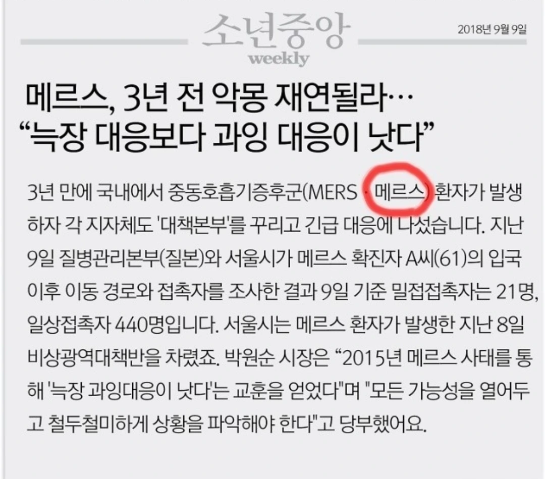 2018년 메르스가 또 발생했지만 대응을 잘했던지 기억조차 나질 않네요