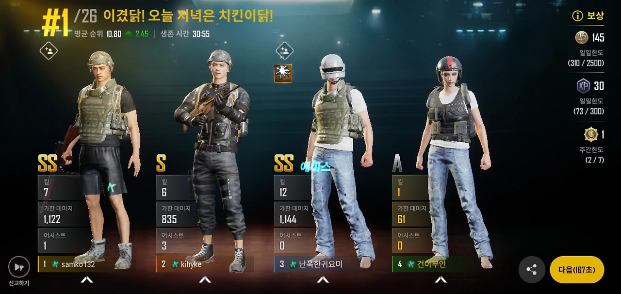 그렇게 4인 가족이 열심히 싸우다 1등을 하기라도 하면 그날은 거의 축제 분위기입니다. 게다가 베그를 계속했더니 가족애에 더불어 전우애가 생깁니다. ㅎㅎㅎ 저도 요새 조금 익숙해졌다고 1 kill(적군 한 명 죽임)도 하고 어쩌다 컨디션이 좋은 날에는 3 kill도 해봤습니다. 그러면 애들이 잘했다고 엄청 칭찬해 줍니다. 어찌나 으쓱하던지요. 그렇게 저는 베그를 좋아하게 되었습니다. 물론 여전히 기력이 딸려 하루에 2게임이나 3게임 정도만 하지만 그 정도로도 아이들은 충분히 즐기고 좋아합니다. 아마도 1945 게임처럼 오래 즐길 것 같은 예감이 듭니다. 캐나다 와서 장금이에 이어 베그 장인이 될 것 같네요 ㅋㅋㅋ