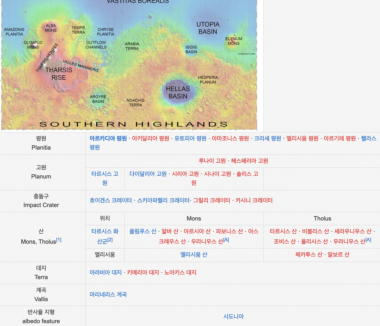 화성의 지리적 구분표