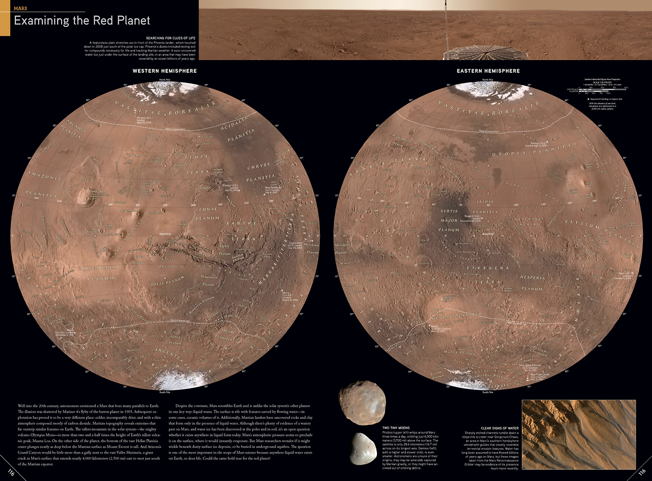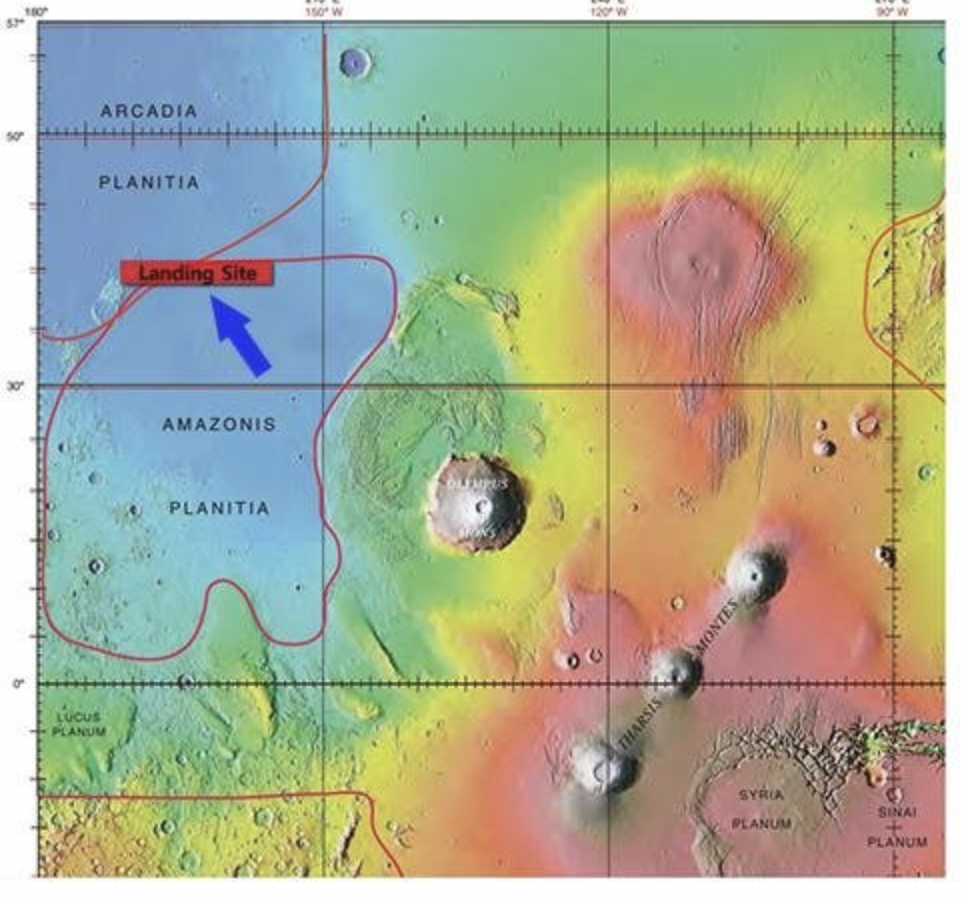 화성의 지도, 왼쪽의 화성 단면에서 시계 11시 방향과 1시 방향에서 아르카디아 평원을 찾을 수 있습니다.