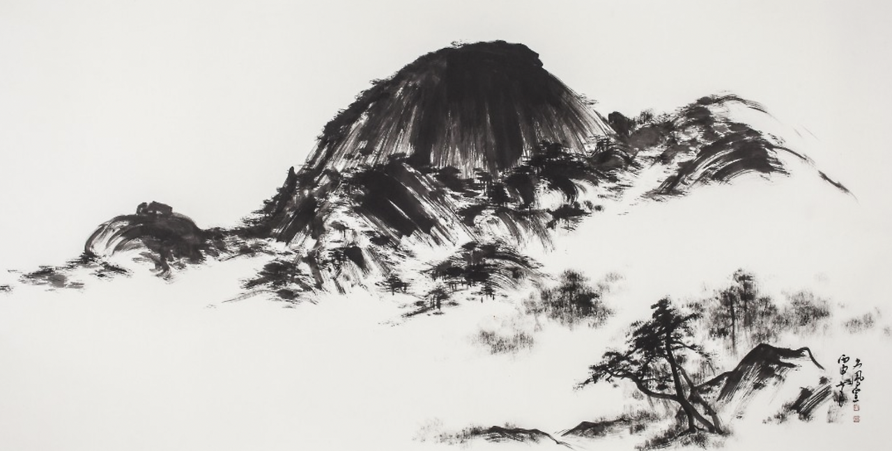 문봉선, <인왕산 2>, 92 x 180cm 지본 수묵 2016.7, 안개 낀 인왕산의 모습에서 존재로서 홀로 빛나는 실존, 신 앞에서 선 단독자 같은 이야기가 저절로 떠오릅니다