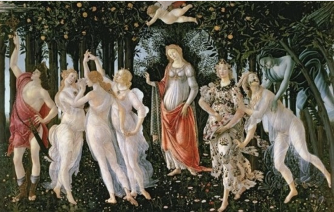 산드로 보티첼리, <봄>, 1478년경, 패널에 템페라, 우피치 미술관(피렌체), 보는 순간 충만한 아름다움으로 감탄하게 되지만 더 이상의 상상의 나래로 나아가지는 못하게 됩니다