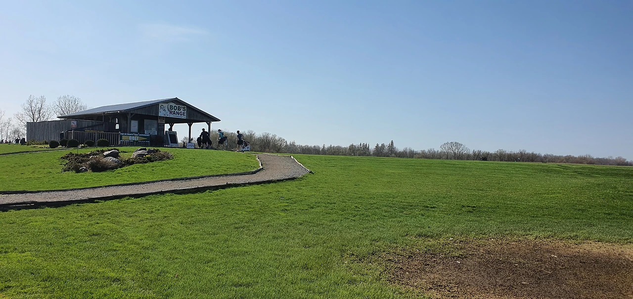 초록 잔디 위로 통나무 건물만 있는 곳이 연습장입니다. ㅎㅎㅎ