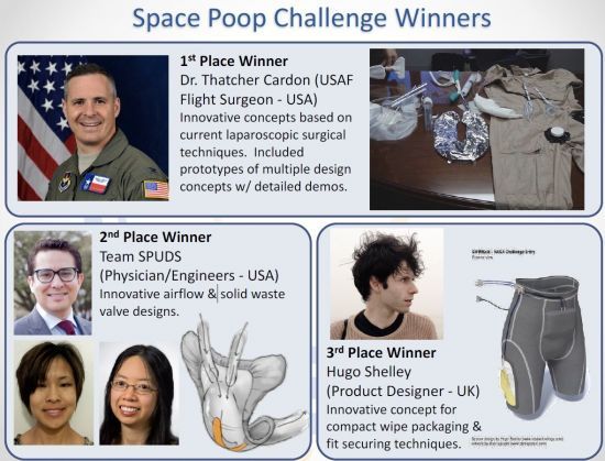 그래서 실제로 NASA에서는 2016년에 상금 3만 달러를 내 걸고 'Space Poop Challenge', 즉 우주에서 최대 6일 이상을 버틸 수 있는 똥 처리 아이디어 대회를 연 적이 있다. 아이디어 상은 총 3팀에게 돌아갔다.