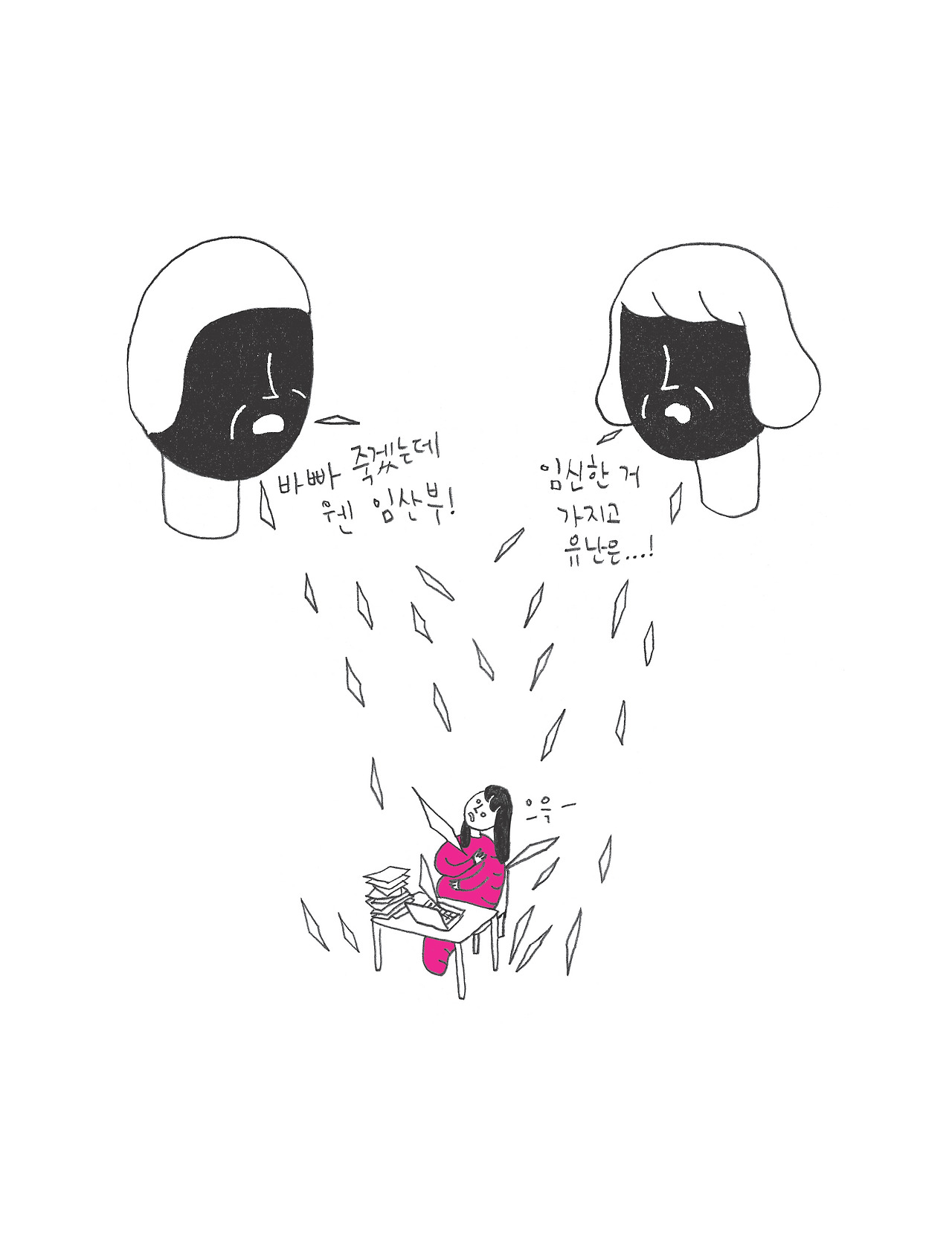 “우리는 애 낳고 석 달 만에 복직이었어. 요즘 애들은 임신이 무슨 벼슬인 줄 아나봐. 임신한 거 가지고 왜 이렇게 유난이니.”