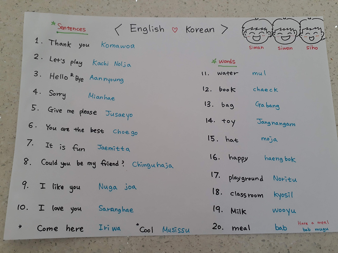 한국말만 쓰는 아이들을 이해하기 위해 선생님이 요청한 자료. (내가 만든 자료들)