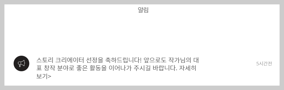 스토리 크리에이터 선정을 축하드립니다!라는 알림.